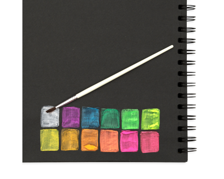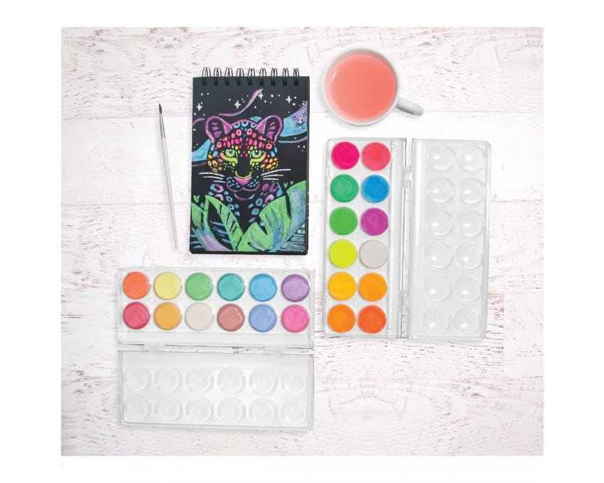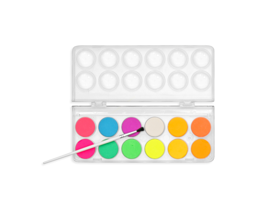 Farby akwarelowe z pędzelkiem w neonowych barwach do malowania na białym i czarnym tle.