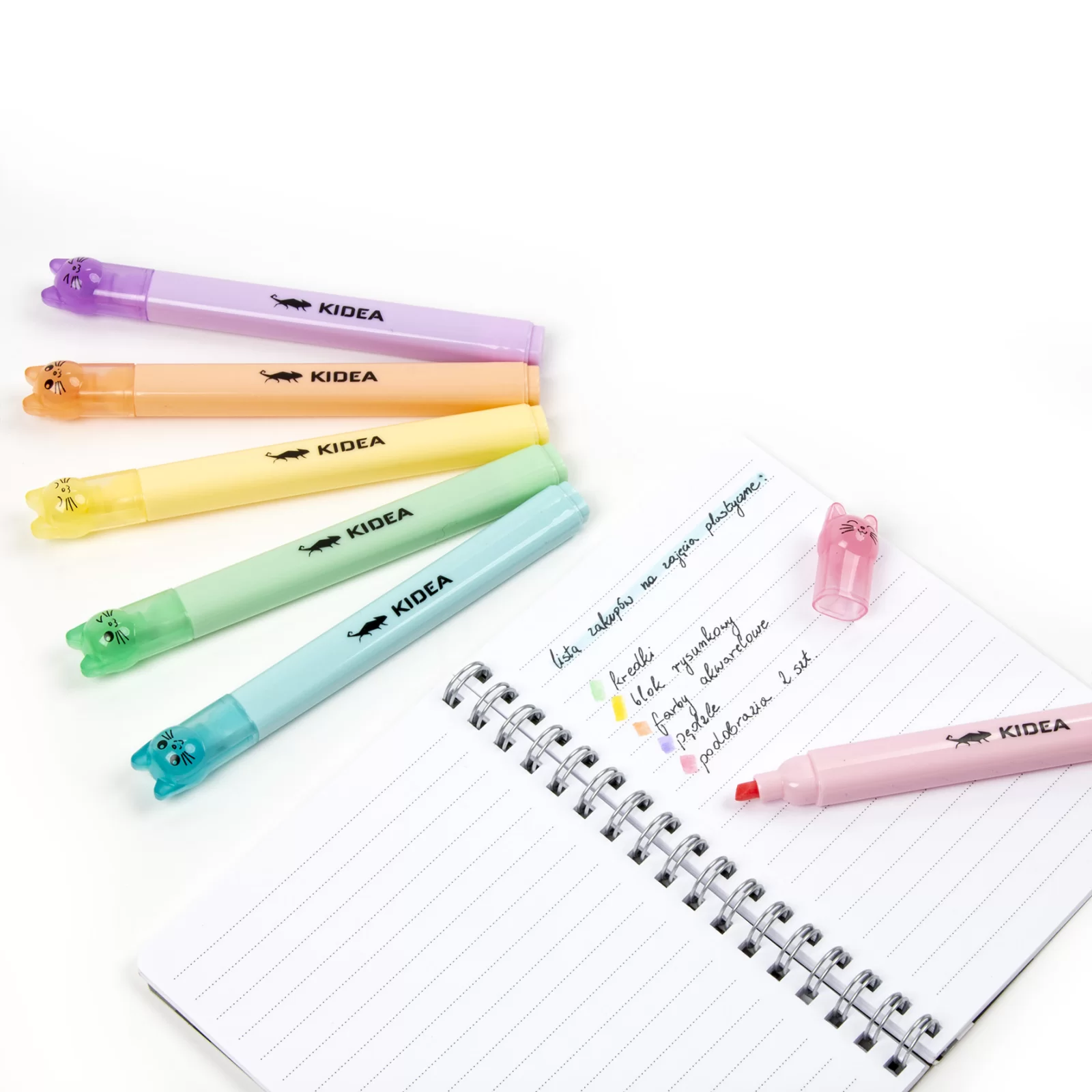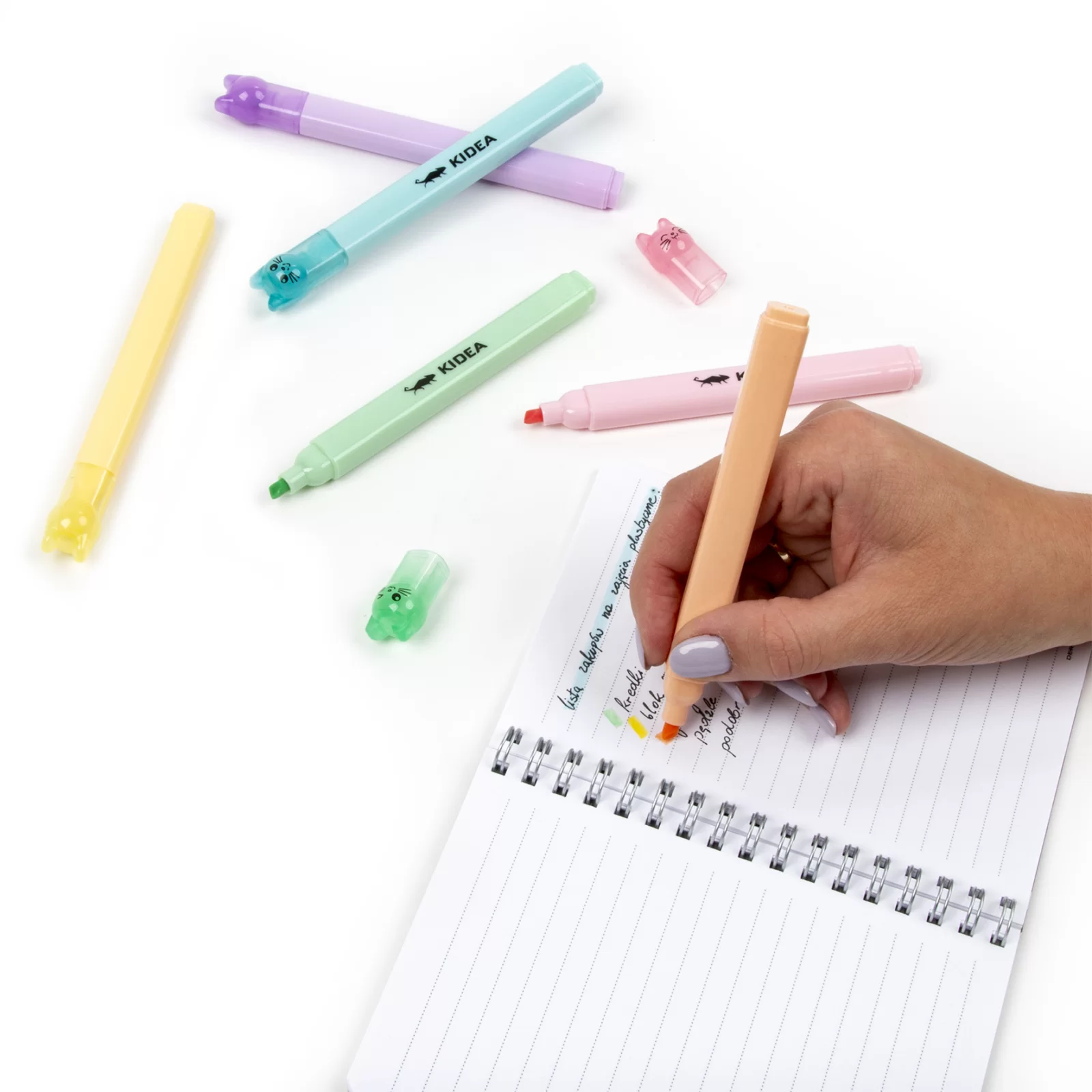 Flamastry pastelowe Kidea z zatyczkami w kształcie kotków w 6 kolorach: zielonym, żółtym, brzoskwiniowym, różowym, fioletowym i niebieskim. Ścięta końcówka zapewnia precyzję, a ergonomiczny kształt flamastrów idealnie wpasowuje się w dziecięcą rękę. Kotki na zatyczkach dodają jedynego w swoim rodzaju, uroczego charakteru. Flamastry pozostawiają na kartce wyraziste, pastelowe kolory. Sprawdzą się zarówno przy tworzeniu prac plastycznych, podkreślaniu, czy zakreślaniu.