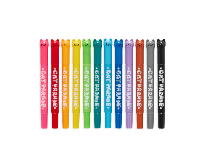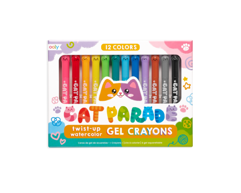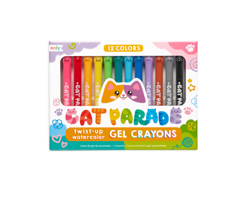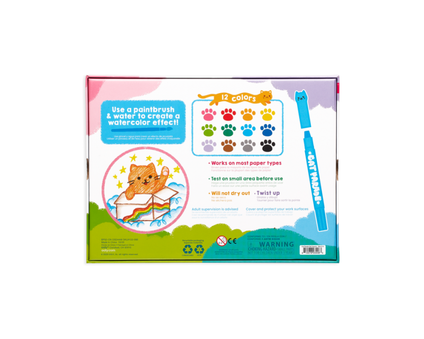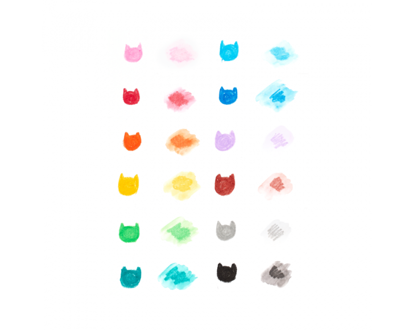 Wykręcane oprawki kredek są łatwe do trzymania, a kocie minki nadają im efektu „wow”, a nawet „miau”. Są rozpuszczalne w wodzie - za pomocą pędzelka można uzyskać, idealnie gładki i rozmyty efekt akwareli. Zestaw składa się z 12 jasnych, intensywnych kolorów umieszczonych w super wygodnych wykręcanych sztyftach zakończonych zabawnymi skuwkami w kształcie kotków.