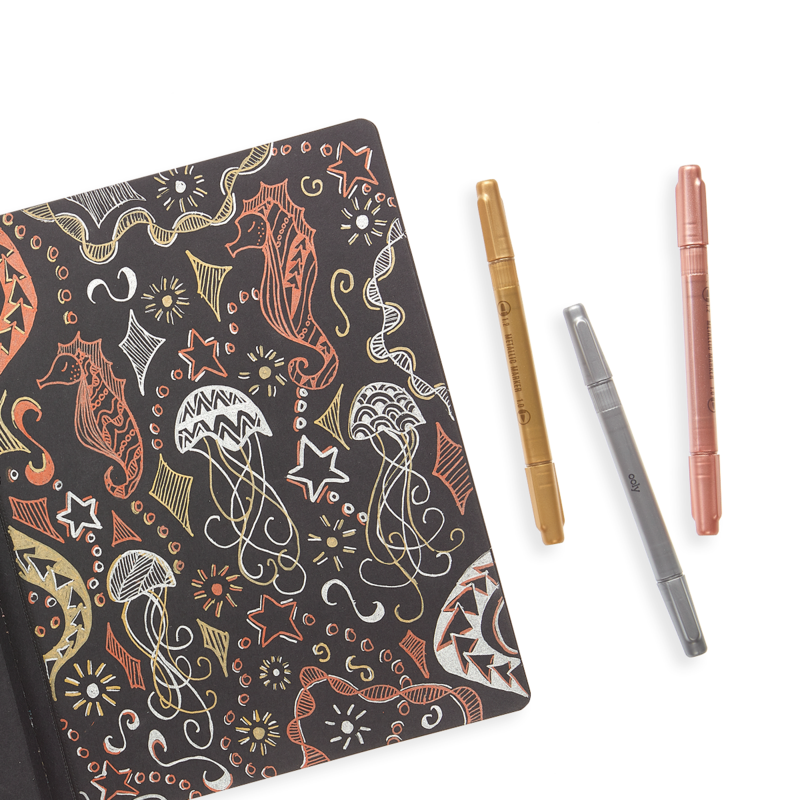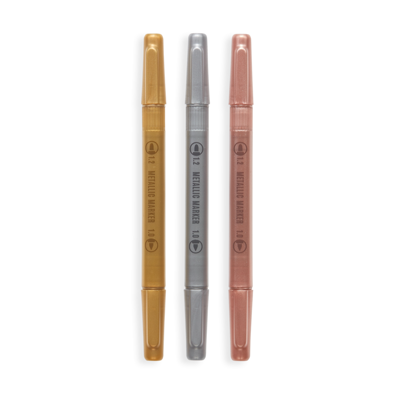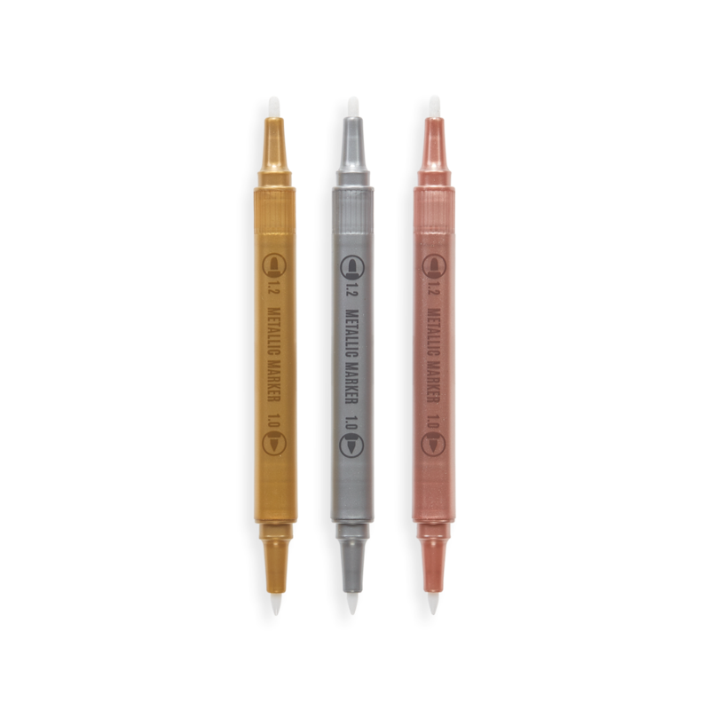Metaliczne pisaki Ooly w kolorze szlachetnych metali srebrnym, złotym i miedzianym. Pisaki mają podwoją końcówkę: cieńszą, spiczastą idealną do detali oraz nieco grubszą zaokrągloną. To doskonały zestaw dla kreatywnych dusz, które nie tylko dużo piszą i planują, ale także z pasją tworzą napisy, rysunki na wszelkich dostępnych powierzchniach.