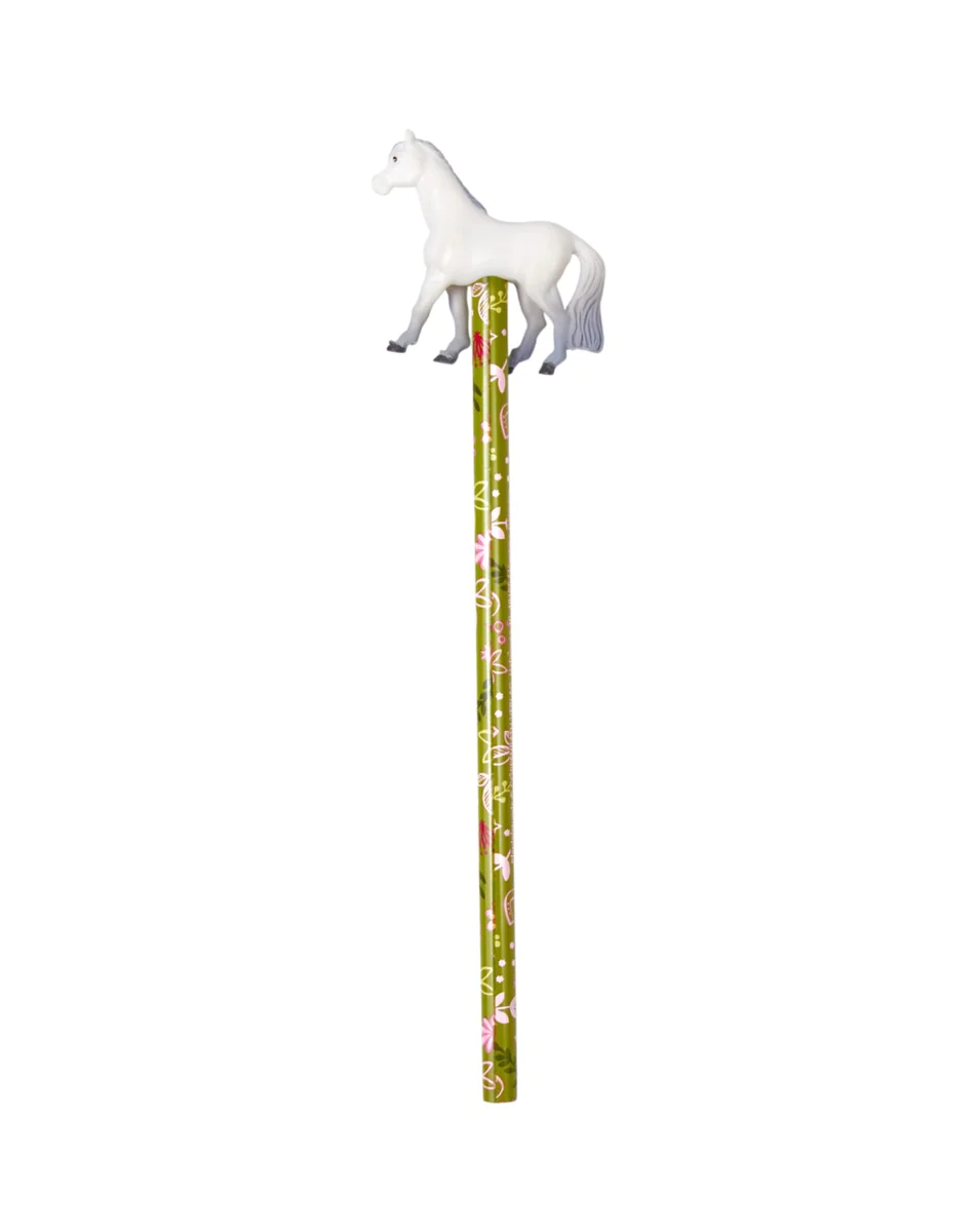 Ołówek z konikiem jest zakończony figurką konia. Ołówek ma kolorowy nadruk w kwiatki, listki. Dostępny w trzech wersjach. Rysik HB średnia twardość.