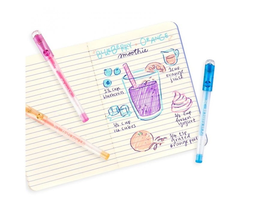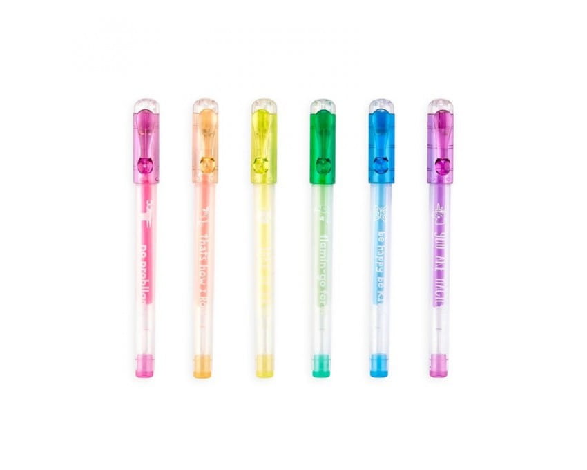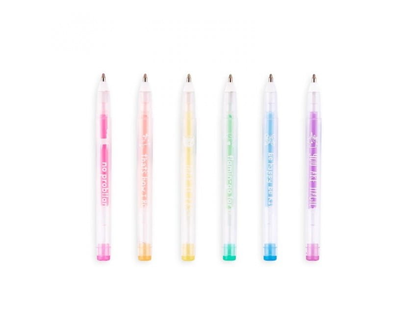 Pachnące żelowe długopisy Ooly to 6 długopisów w wersji kieszonkowej, które przyciągają wzrok i węch. Za każdym razem, gdy piszesz lub rysujesz będziesz pod wrażeniem, jaki interesujący, pastelowy kolor uzyskasz. Sześć żelowych długopisów. Każdy w energetycznym kolorze. Piszą płynnie i efektownie nawet na czarnym tle a ponadto, bardzo przyjemnie pachną. Ich niewielki rozmiar pozwala mieć je zawsze pod ręką, mieszczą się nawet do niewielkiej torebki. Dodatkowo, na każdym długopisie widniej motywujące hasło.