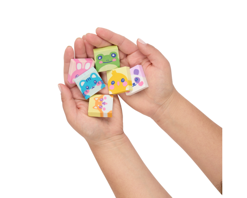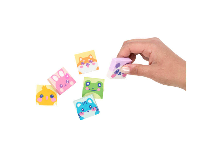Różowy króliczek, przyjazny lisek, słodki kurczaczek, zielona żaba, przytulny kociak i fioletowa panda sprawią, że nauka będzie przyjemnością! Słodkie gumki bardzo dobrze wymazują ślady po ołówku. Jedno weź do szkoły, inną podaruj przyjacielowi, a następną miej w domu pod ręką.