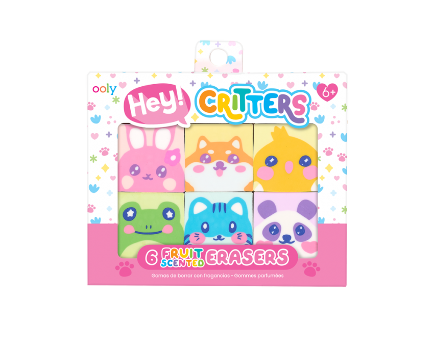 Kolorowe gumki do ścierania Ooly Hey Critters (6 sztuk) z wesołymi zwierzakami. Zestaw zawiera 6 pachnących owocami gumek.