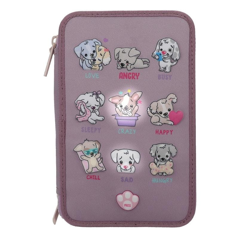 Piórnik jest zapinany na zamek błyskawiczny. Na dole znajduje się psia łapka, która po wciśnięciu uruchamia światełka LED i niektóre elementy piórnika są podświetlone. Piórnik szkolny ma liczne przegródki, dzięki czemu pomieści wszystkie przybory piśmiennicze oraz ułatwi przechowywanie ich w należytym porządku.