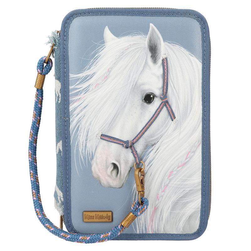 Jeansowy piórnik z koniem na okładce Miss Melody jest zapinany na zamek błyskawiczny. Piórnik szkolny ma liczne przegródki, dzięki czemu pomieści wszystkie przybory piśmiennicze oraz ułatwi przechowywanie ich w należytym porządku. Piórnik Miss Melody w delikatnym dżinsowym kolorze ma z boku i z tyłu materiał z prawdziwego dżinsu, z nadrukiem białych koni. Z przodu błyszczy biała głowa konia z bujną grzywą i kantarem.