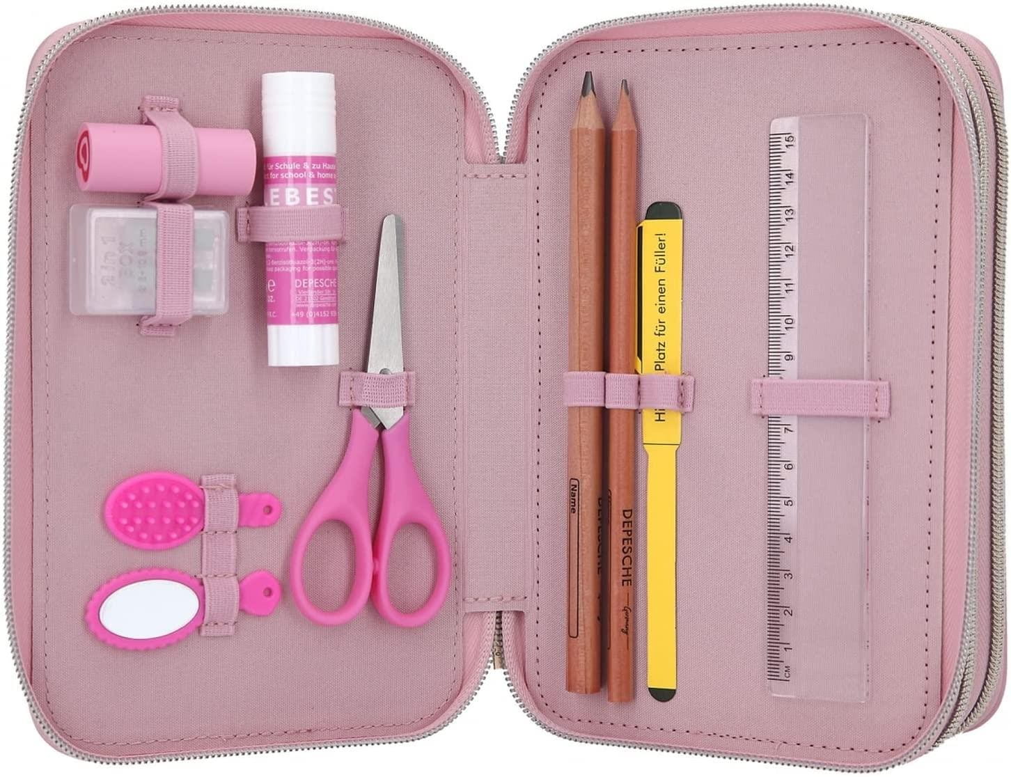 Różowy piórnik z milutkim koniem na froncie Miss Melody jest zapinany na zamek błyskawiczny. Grzywę konia można czesać dzięki załączonej szczotce i lusterku. Piórnik szkolny ma liczne przegródki, dzięki czemu pomieści wszystkie przybory piśmiennicze oraz ułatwi przechowywanie ich w należytym porządku.