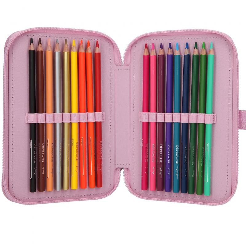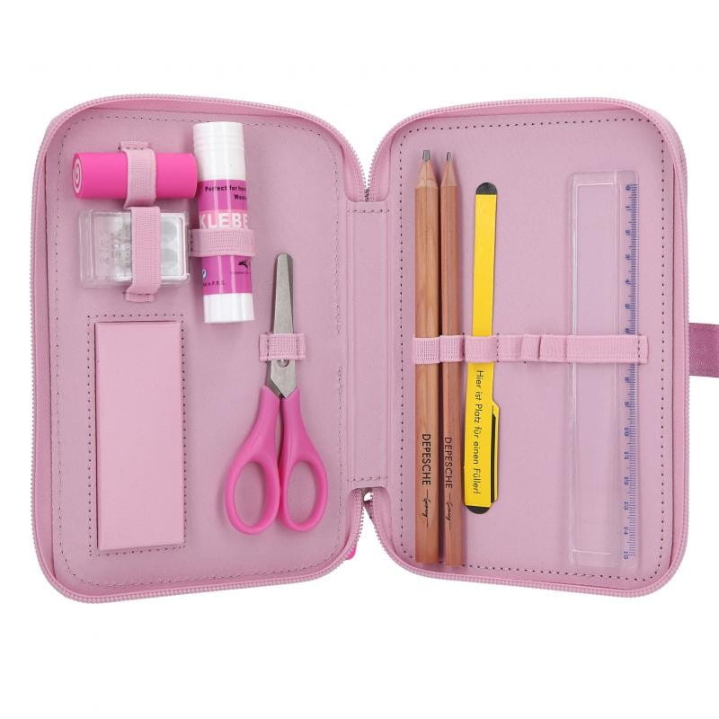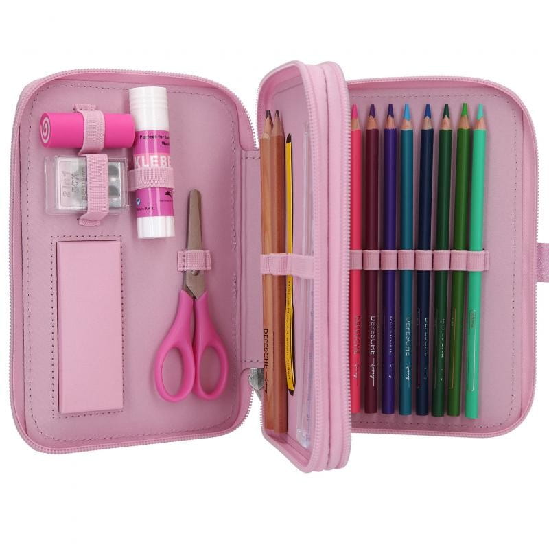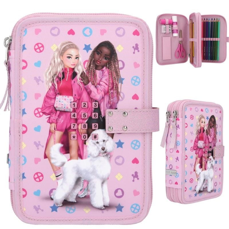 Trzyczęściowy piórnik z wyposażeniem TOPModel, otwierany i zamykany na kod. Różowy Piórnik z modelkami jest dodatkowo zapinany na zamek błyskawiczny. Piórnik szkolny ma liczne przegródki, dzięki czemu pomieści wszystkie przybory piśmiennicze oraz ułatwi przechowywanie ich w należytym porządku.