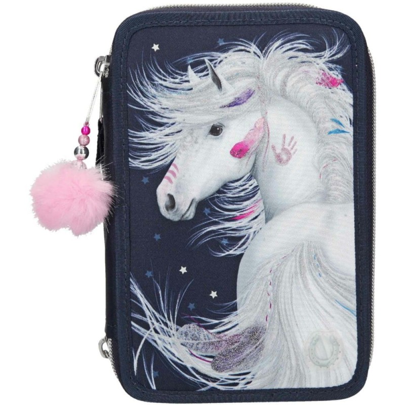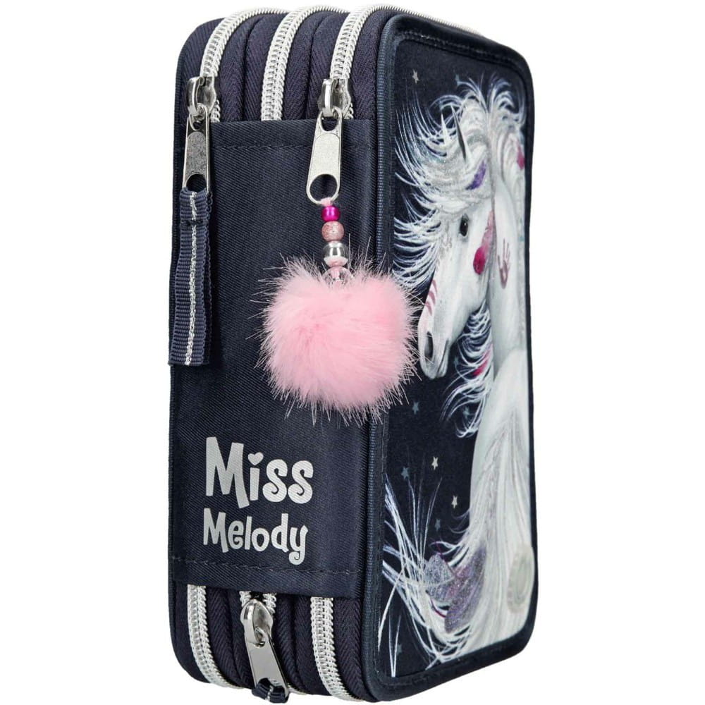 Granatowy piórnik z błyszczącym koniem na froncie Miss Melody jest zapinany na zamek błyskawiczny i udekorowany tasiemką oraz różowym pomponem. Grzywa siwego konia połyskuje od brokatu, a na dole znajduje się podkowa, która po wciśnięciu uruchamia światełka led i niektóre elementy piórnika są podświetlone. Piórnik szkolny ma liczne przegródki, dzięki czemu pomieści wszystkie przybory piśmiennicze oraz ułatwi przechowywanie ich w należytym porządku.