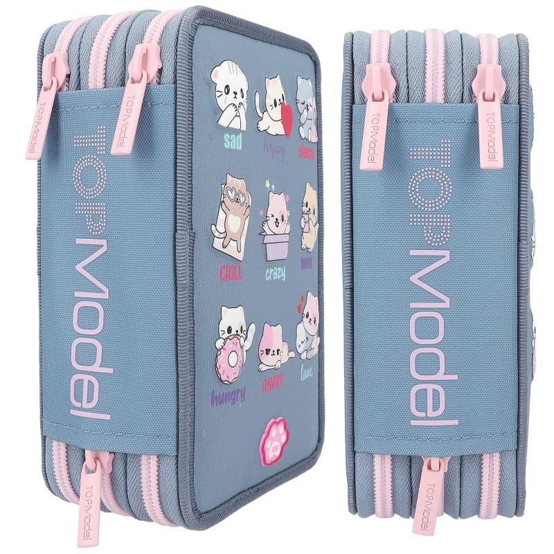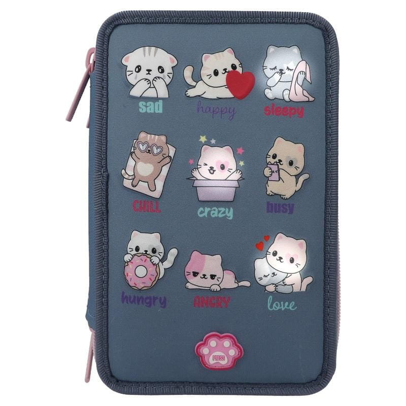 Wpełni wyposażony piórnik szkolny z motywem kotków 3D w różnych nastrojach na froncie. Piórnik jest zapinany na zamek błyskawiczny. Na dole znajduje się kocia łapka, która po wciśnięciu uruchamia światełka LED i niektóre elementy piórnika są podświetlone. Piórnik szkolny ma liczne przegródki, dzięki czemu pomieści wszystkie przybory piśmiennicze oraz ułatwi przechowywanie ich w należytym porządku.