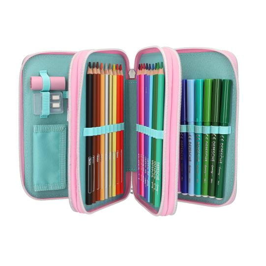 Mieniący się piórnik z wyposażeniem Top Model jest zapinany na zamek błyskawiczny, udekorowany zawieszką w kształcie łańcuszka. Okładka piórnika ma wewnątrz brokat. Piórnik szkolny ma liczne przegródki, dzięki czemu pomieści wszystkie przybory piśmiennicze oraz ułatwi przechowywanie ich w należytym porządku. Odkryj trójdzielny piórnik TOPModel Triple Pencil Case ELECTRIC, który łączy nowoczesny design z praktycznym wnętrzem. Jego dynamiczny, elektryzujący wzór przyciąga wzrok i dodaje stylu każdej uczennicy, która ceni modne akcesoria szkolne.