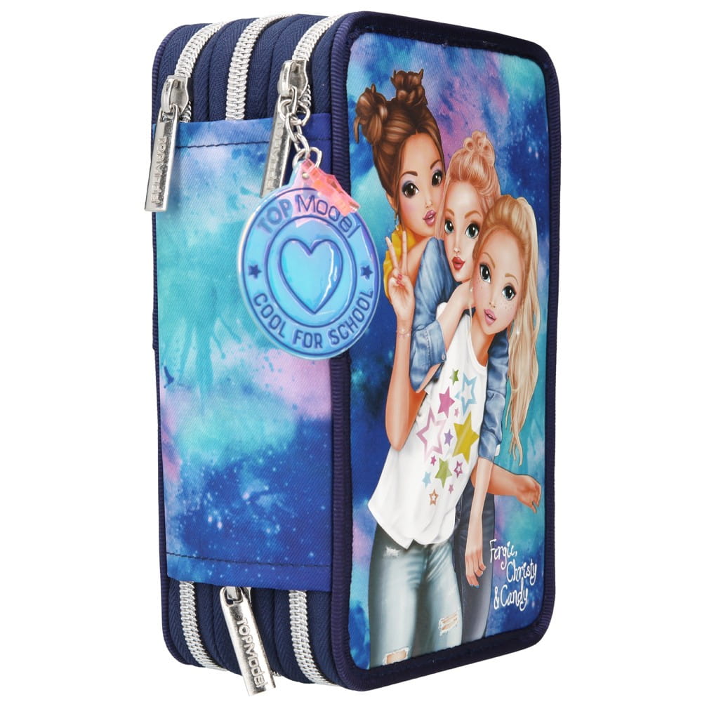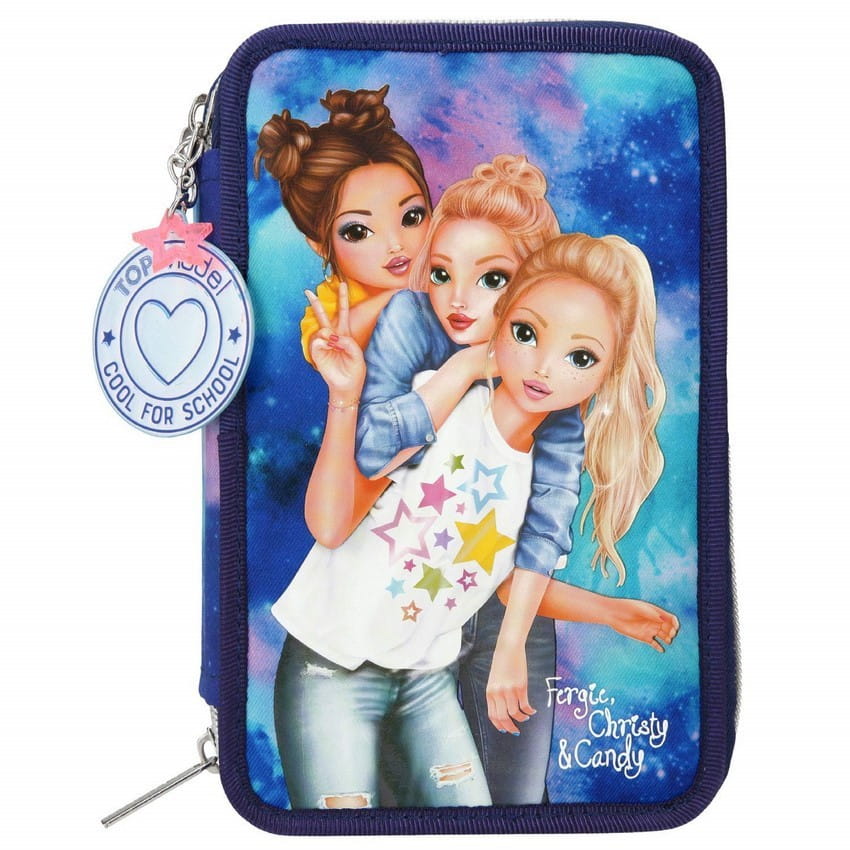 Granatowy piórnik z dziewczynami Top Model przedstawia modelki Fergie, Christy i Candy, jest zapinany na zamek błyskawiczny, udekorowany zawieszką. Piórnik szkolny ma liczne przegródki, dzięki czemu pomieści wszystkie przybory piśmiennicze oraz ułatwi przechowywanie ich w należytym porządku.