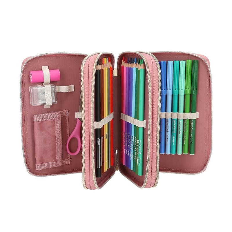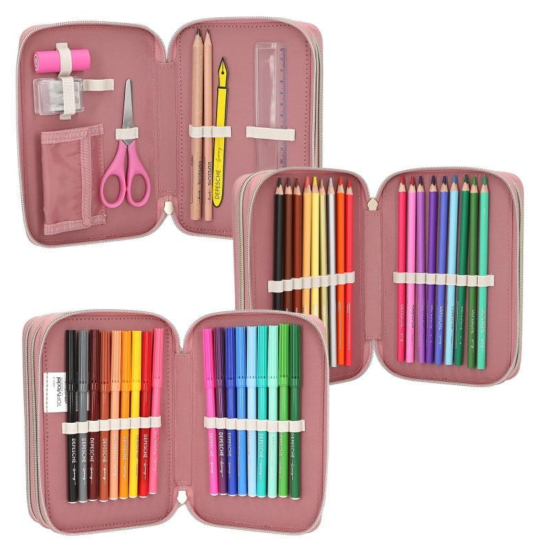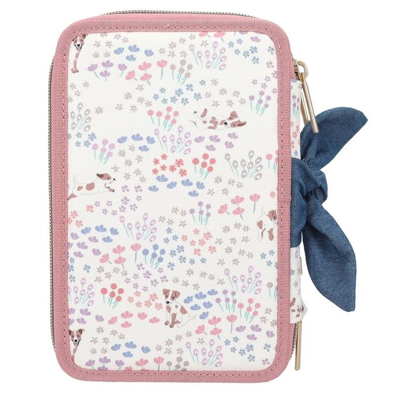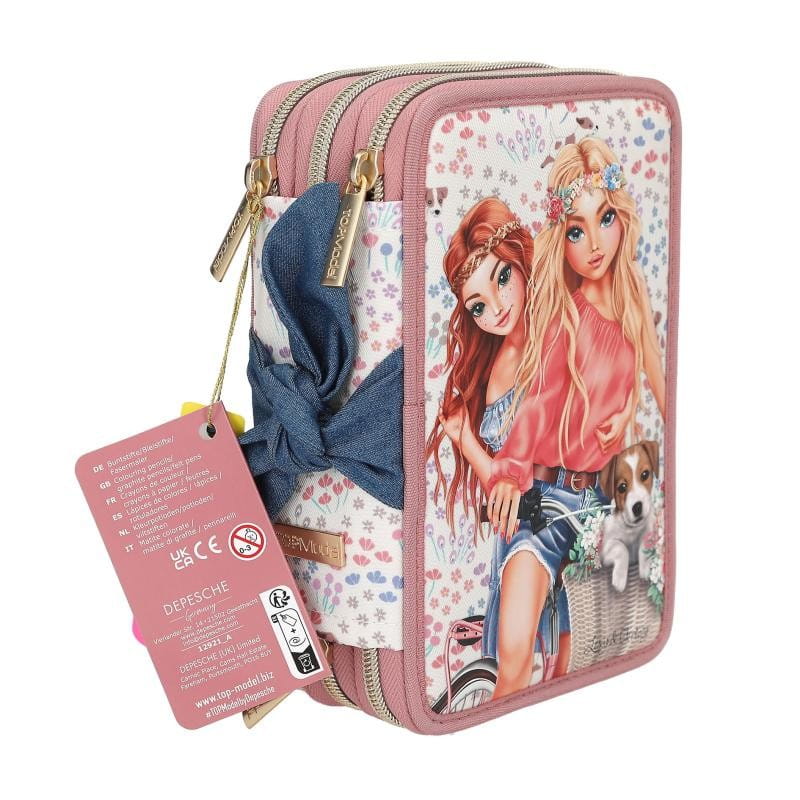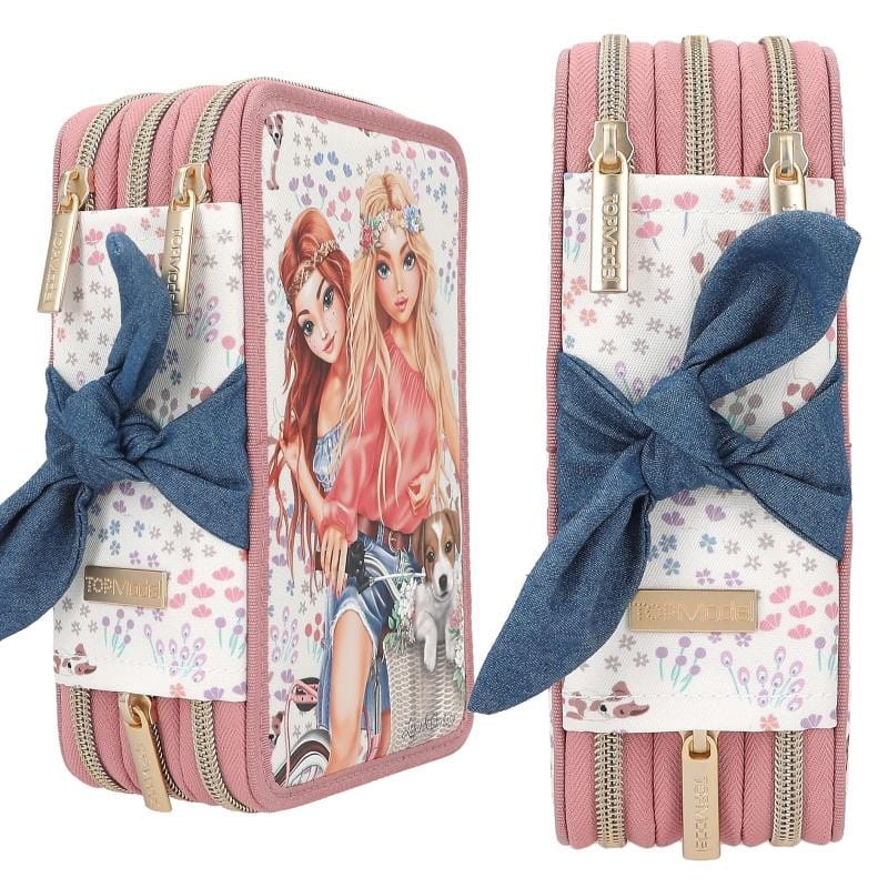 Kwiatowy romantyczny piórnik z pełnym wyposażeniem, trzyczęściowy, z kompletem przyborów do pisania i malowania. Piórnik Top Model jest zapinany na zamek błyskawiczny, ma zawieszkę w kształci kokardki przyczepioną do zamka, by umożliwić szybkie odpinanie. Piórnik szkolny ma liczne przegródki, dzięki czemu pomieści wszystkie przybory piśmiennicze oraz ułatwi przechowywanie ich w należytym porządku.