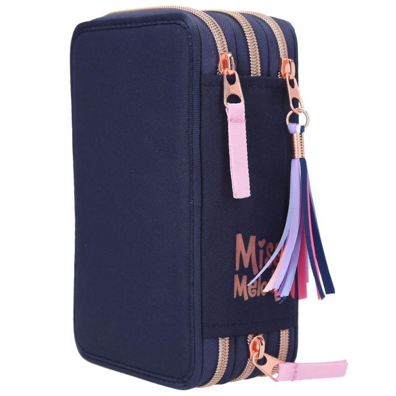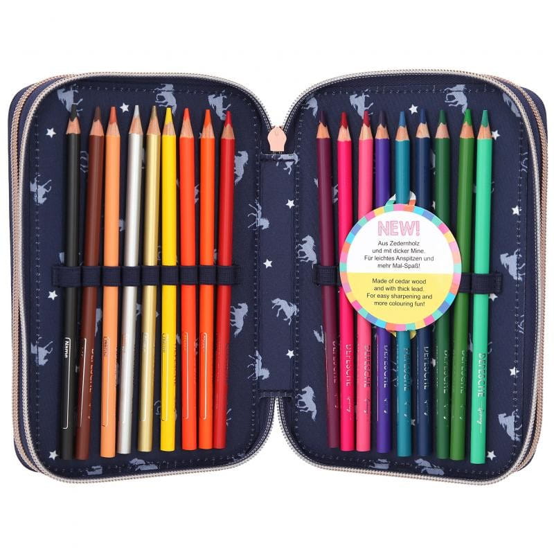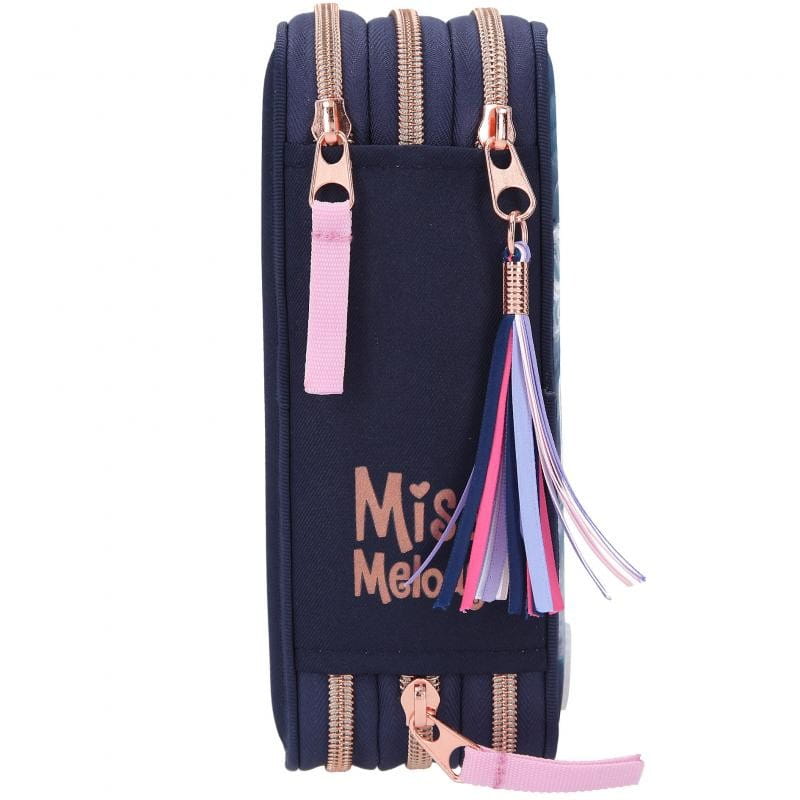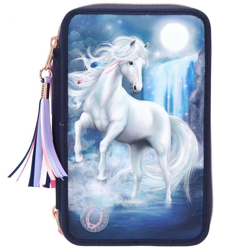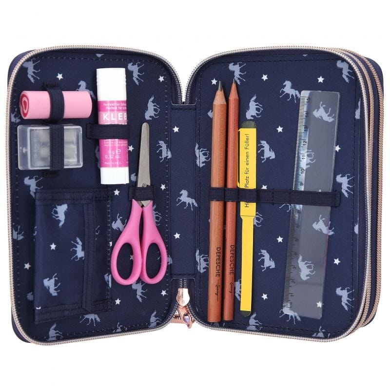Granatowy piórnik z błyszczącym koniem na froncie Miss Melody jest zapinany na zamek błyskawiczny i udekorowany frędzlem. Grzywa siwego konia połyskuje od brokatu, a na dole znajduje się podkowa, która po wciśnięciu uruchamia światełka led i niektóre elementy piórnika są podświetlone. Piórnik szkolny ma liczne przegródki, dzięki czemu pomieści wszystkie przybory piśmiennicze oraz ułatwi przechowywanie ich w należytym porządku.