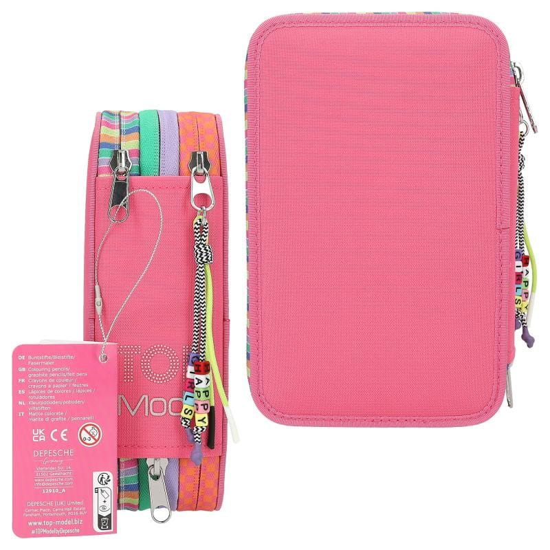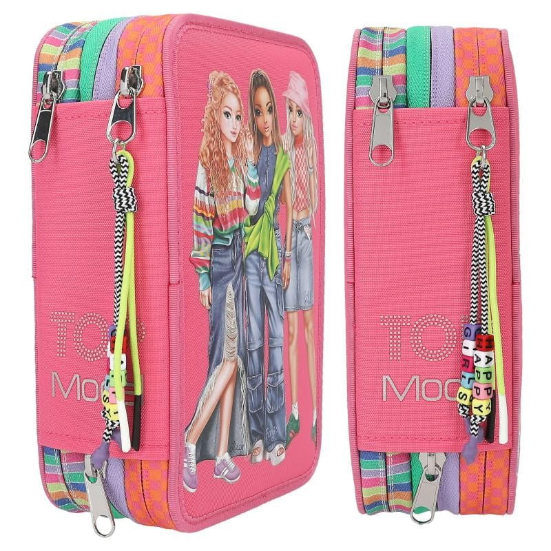 Potrójny piórnik z nadrukiem modelek jest zapinany na zamek błyskawiczny z ozdobnymi zawieszkami: modnymi koralikami i tasiemkami. Trzy oddzielne przegródki zapinane na zamek są całkowicie wypełnione przyborami szkolnymi. Piórnik szkolny ma liczne przegródki, dzięki czemu pomieści wszystkie przybory piśmiennicze oraz ułatwi przechowywanie ich w należytym porządku.