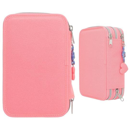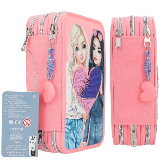 Potrójny piórnik z pełnym wyposażeniem szkolnym jest zapinany na zamek błyskawiczny. Trzy oddzielne przegródki zapinane na zamek są całkowicie wypełnione przyborami szkolnymi. Piórnik szkolny ma liczne przegródki, dzięki czemu pomieści wszystkie przybory piśmiennicze oraz ułatwi przechowywanie ich w należytym porządku. Piórnik TOPModel ma z przodu duże serce wykonane z odwracalnych cekinów, które mieni się odcieniami różu i fioletu