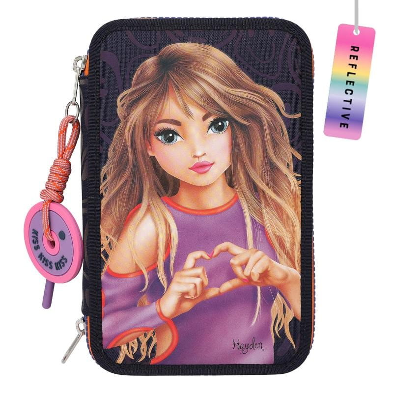 Potrójny piórnik z pełnym wyposażeniem szkolnym jest zapinany na zamek błyskawiczny. Trzy oddzielne przegródki zapinane na zamek są całkowicie wypełnione przyborami szkolnymi. Piórnik szkolny ma liczne przegródki, dzięki czemu pomieści wszystkie przybory piśmiennicze oraz ułatwi przechowywanie ich w należytym porządku. Dołączona urocza zawieszka z napisem Kiss, granatowy kolor, neonowe wstawki oraz motyw modelek spodobają się dziewczynkom.
