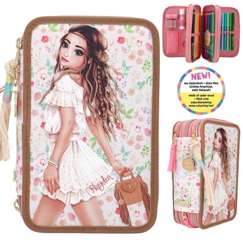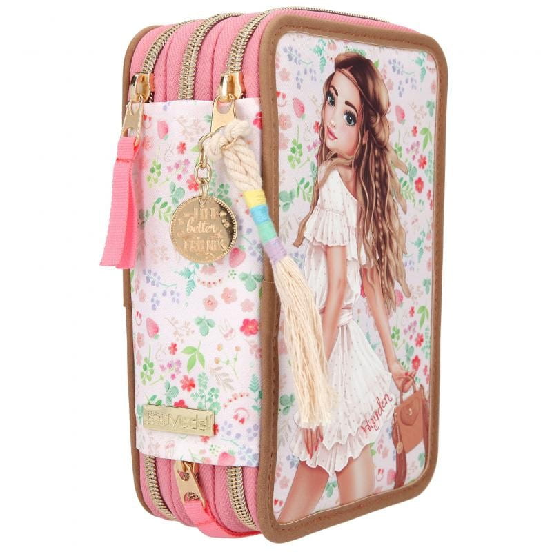 Kwiatowy romantyczny piórnik z pełnym wyposażeniem, trzyczęściowy, z kompletem przyborów do pisania i malowania. Piórnik Top Model jest zapinany na zamek błyskawiczny, ma zawieszkę przyczepioną do zamka, by umożliwić szybkie odpinanie. Piórnik szkolny ma liczne przegródki, dzięki czemu pomieści wszystkie przybory piśmiennicze oraz ułatwi przechowywanie ich w należytym porządku.