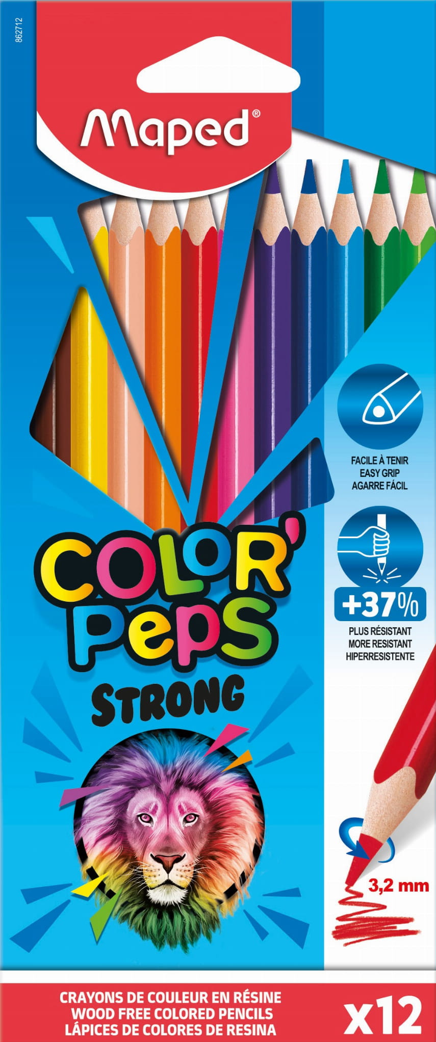 Zestaw ergonomicznych kredek Color’Peps STRONG JUMBO w 12 kolorach, stworzonych z myślą o dzieciach. Kredki są wykonane z żywicy syntetycznej, co wpływa na jakość korpusu – jest elastyczny i giętki. Trójkątny kształt pomaga dzieciom prawidłowo trzymać kredki w dłoni. Wzmocniony grafit o przekroju 4 mm jest wyjątkowo odporny na kruszenie i łamanie. Kredki są łatwe to temperowania – nie strzepią się i nie zostawiają drzazg.