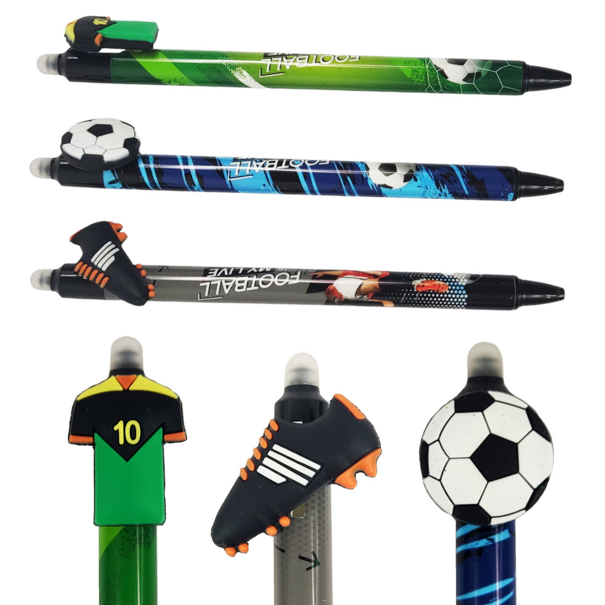 Długopis wymazywalny z figurką piłkarską: piłką nożną, butami sportowymi i koszulką piłkarską - zestaw 3 sztuki.
