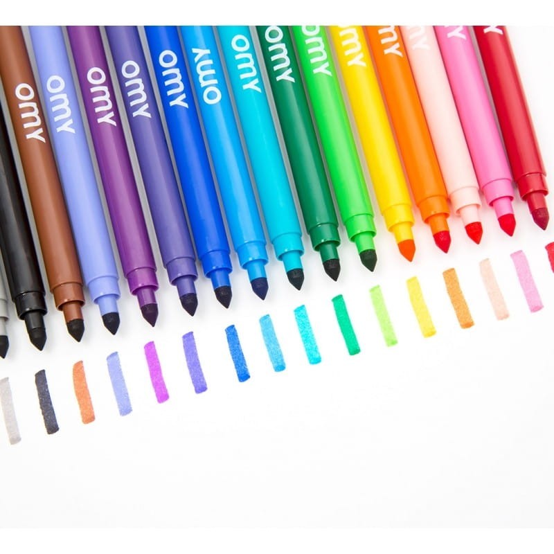 16 flamastrów Omy jest łatwo zmywalne za pomocą myła i wody. Podwójna końcówka cienka i gruba, umożliwia preryjne pisanie, jak i malowanie większych powierzchni.