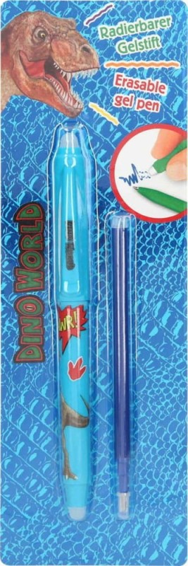 Zmazywalny długopis Erasable Gel Pen marki Depesche pisze na niebiesko, a specjalna gumka do długopisu pozwala całkowicie wymazać lub poprawić zapiski. Magiczny długopis w dinozaury ma 2 końcówki do ścierania oraz zapasowy wkład żelowy.