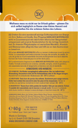 Sól do kąpieli dla dorosłych otula ciepłem aromatów pomarańczy, cynamonu, goździków i wanilii. Kojąca kąpiel pielęgnacyjna w soli z dodatkiem naturalnych olejków eterycznych z bergamotki zapewnia odprężenie. W składzie saszetki znajdziemy intensywny kompleks pielęgnujący z olejkiem migdałowym, alantoiną i białkiem pszenicy, które ochraniają skórę przed wysuszeniem. Kąpiel w soli działa relaksująco, pozytywnie wpływa na nasz nastrój, otula ciepłem zwłaszcza, gdy pogoda na zewnątrz nie rozpieszcza.
