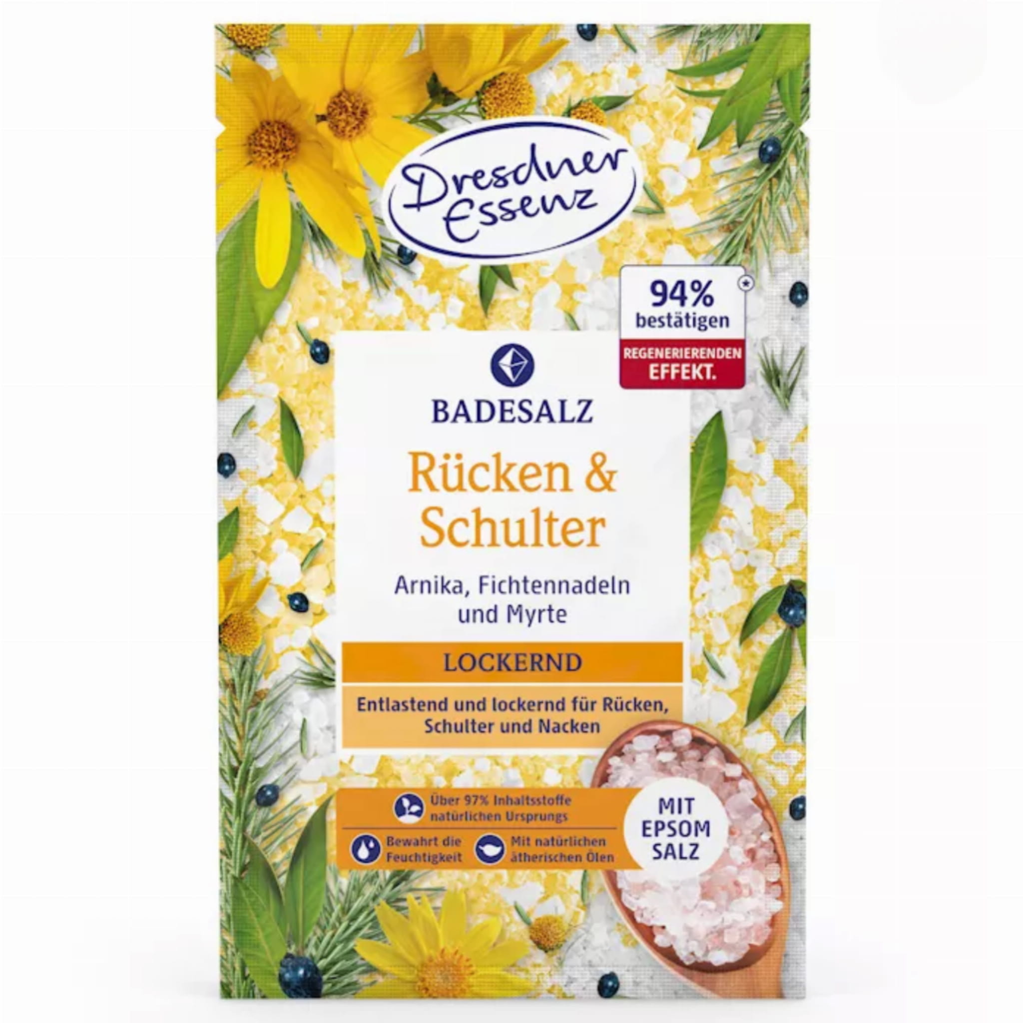 Relaksująca sól do kąpieli PLECY & RAMIONA z solą Epsom zawierającą magnez, wzbogacona jest naturalnymi olejkami eterycznymi z igieł mirtu i świerku oraz ekstraktem z arniki. W połączeniu z ciepłą wodą sól do kąpieli działa szczególnie łagodząco i równoważąco, pomaga złagodzić napięcie i poprawia samopoczucie pleców, ramion i szyi.