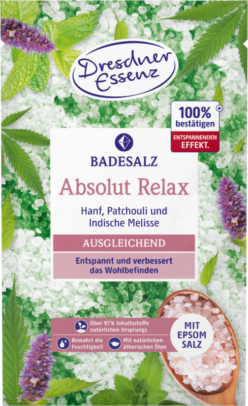 Naturalna sól do kąpieli z Morze Martwego Absolut Rlax z solą Epsom zawierającą magnez niemieckiej marki Dresdner Essenz pomoże wyciszyć się i poprawić samopoczucie dorosłym po ciężkim dniu. Sól morska zawiera drogocenne składniki mineralne i aktywne olejki indyjskiej melisy i paczuli. Olejek z melisy pomaga odzyskać wewnętrzna harmonię i spokój umysłu. Wyselekcjonowane, dobroczynne olejki eteryczne w połączeniu z ciepłą wodą działają uspokajająco i przywracają równowagę.