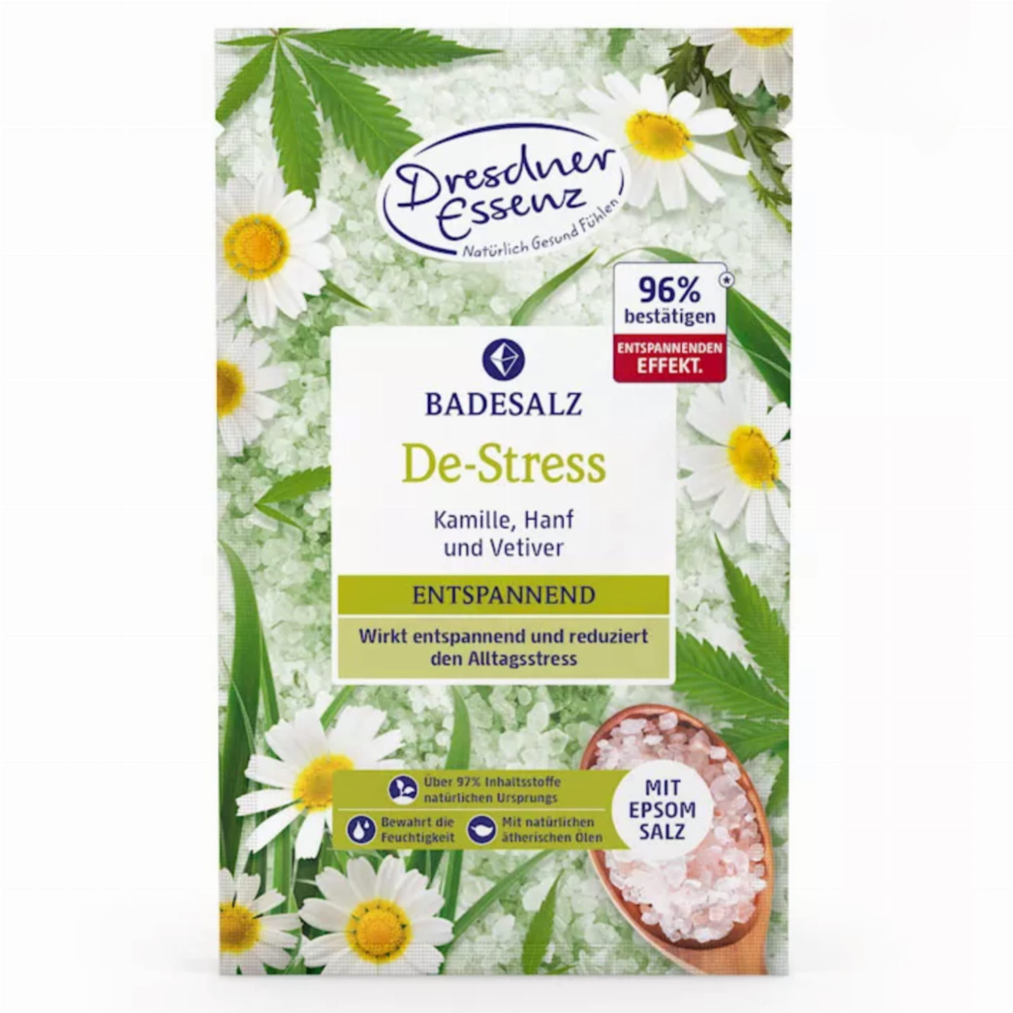 Kojąca sól do kąpieli DE-STRESS z solą Epsom zawierającą magnez, wzbogacona naturalnym olejkiem eterycznym z wetiweru, olejem konopnym i ekstraktem z rumianku. W połączeniu z ciepłą wodą sól do kąpieli działa równoważąco i relaksująco na ciało i duszę. Pomaga zredukować codzienny stres, zapewnia relaks i dobre samopoczucie. Nasze sole do kąpieli wzbogacone są o cenną sól Epsom. Sól Epsom ma wysoką zawartość magnezu i jest używana podczas kąpieli, aby pomóc zregenerować i odciążyć organizm. Pomaga zrelaksować się i zmniejszyć codzienny stres.