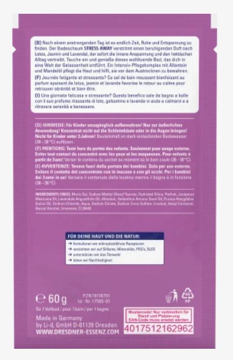 Naturalna sól do kąpieli z Morze Martwego Schaumbad Stress Away niemieckiej marki Dresdner Essenz to sól do kąpieli o masie 60 gramów, mająca za zadanie redukować stres i zapewnić relaks. Formuła zawiera mieszankę naturalnych olejków eterycznych i ekstraktów roślinnych, które są znane ze swoich właściwości uspokajających i odprężających. W skład mogą wchodzić takie składniki jak olejek lawendowy, lotosu i jaśminu, które redukują napięcie i pomagają odprężyć umysł oraz ciało podczas kąpieli.