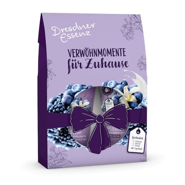 Zestaw prezentowy kosmetyków Dresdner Essenz o naturalnym składzie, pielęgnujących właściwościach i delikatnym zapachu jagód i wanilii. Naturalne kosmetyki zawierają cenne olejki z orzechów makadamia, proteiny pszenicy, alantoinę, pachną owocami. Domowe Wellness zapewnia prawdziwy relaks dla ciała i zmysłów.