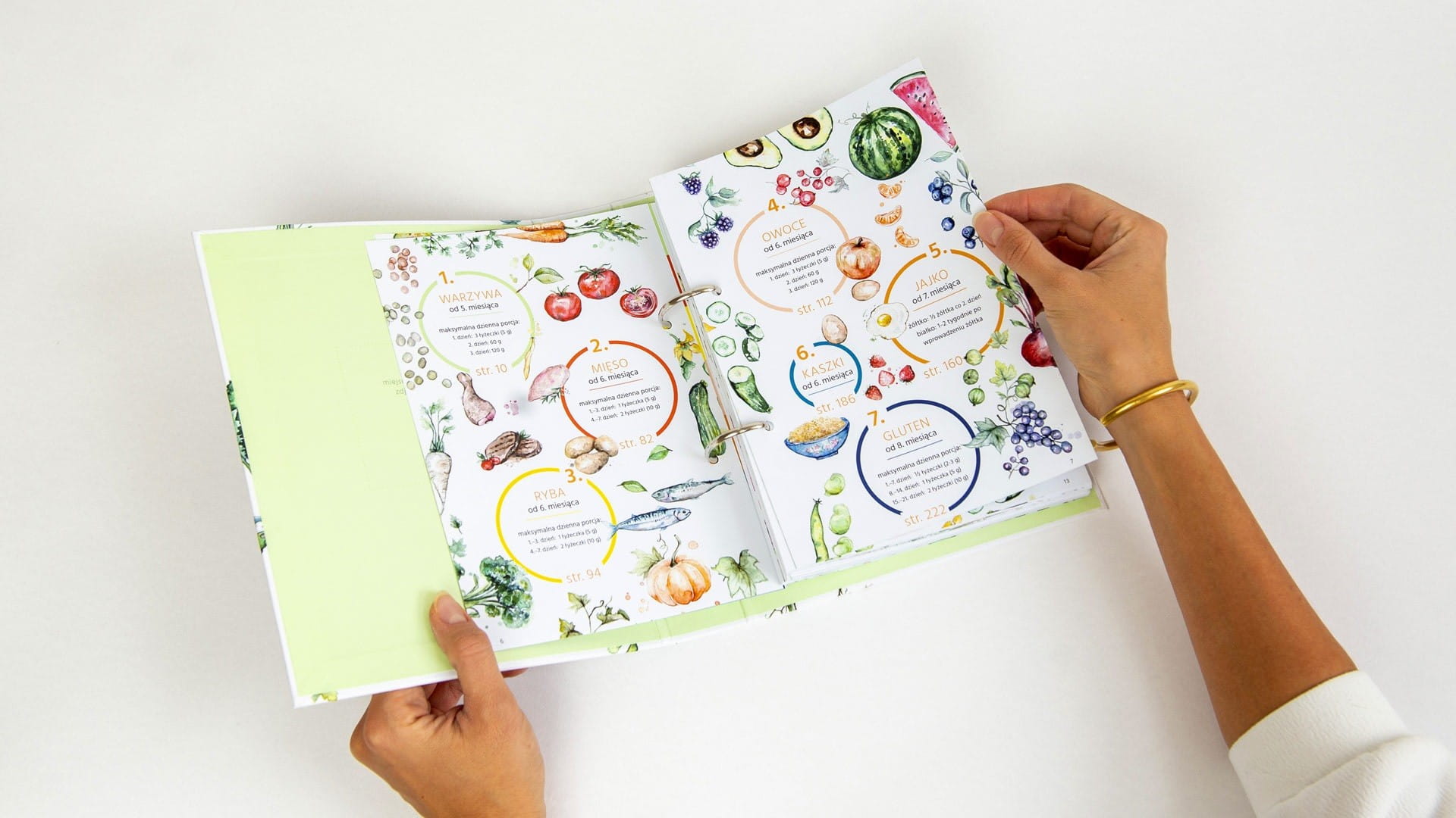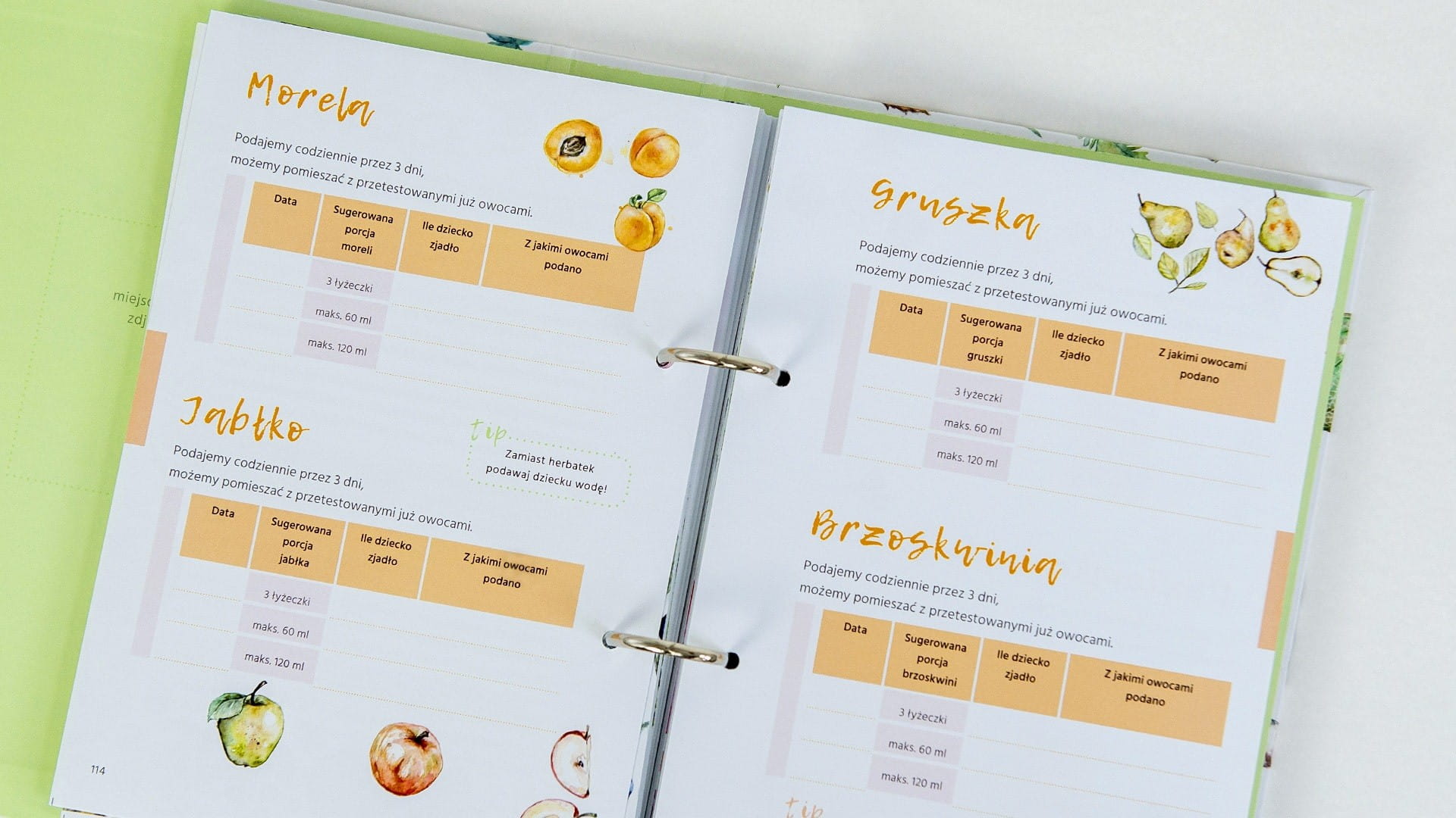 - Przejrzysty i funkcjonalny układ, kategorie produktów oraz dokładny schemat podawania nowych produktów w zależności od wieku dziecka.