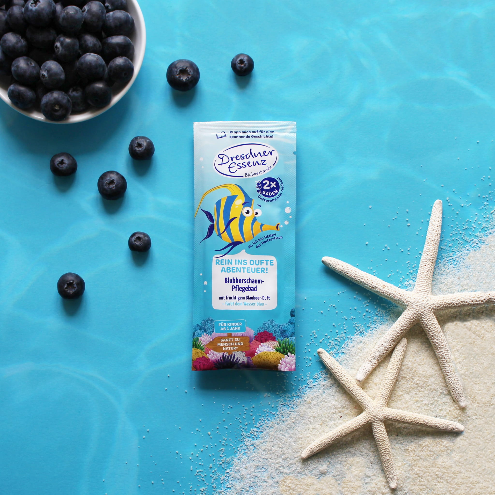 Pachnąca kąpiel w błękitnej wodzie z lekką pianką. Pieniąca się sól do kąpieli dla dzieci Bubble Gang Dresdner Essenz o owocowym zapachu jagód. Sól do kąpieli z odżywczym olejkiem migdałowym jest specjalnie dostosowana do delikatnej skóry dzieci.