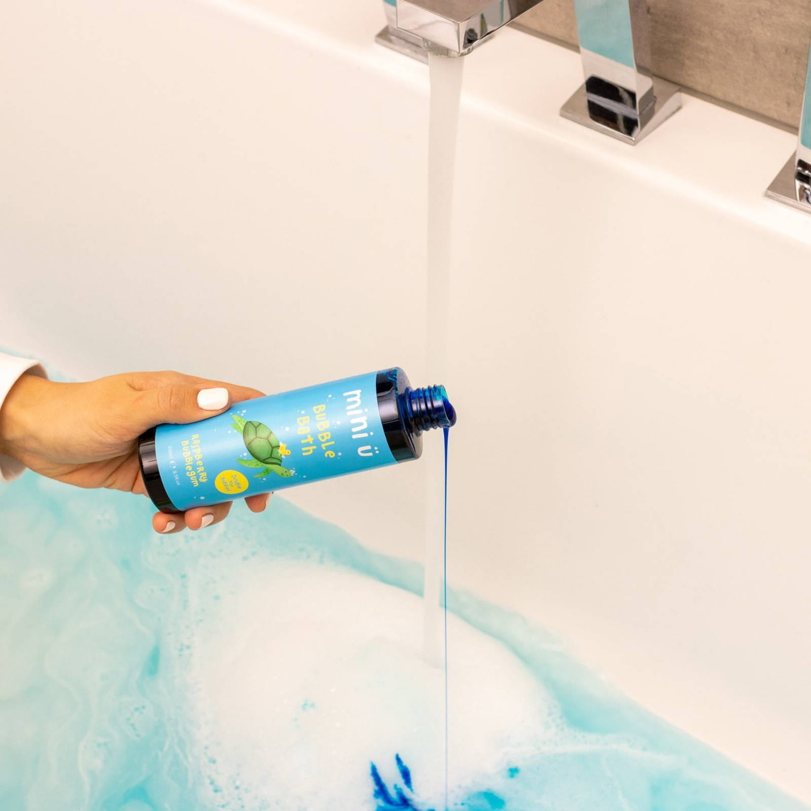 Płyn do kąpieli zimniacy kolor wody na niebieski, pieniący się i tworzący bąbelki, naturalny i delikatny dla skóry dziecka, Płyn do kąpania o zapachu malinowej gumy balonowej Raspberry Bubblegum marki Mini zamieni zwykłą kąpiel w bajeczną przygodę.