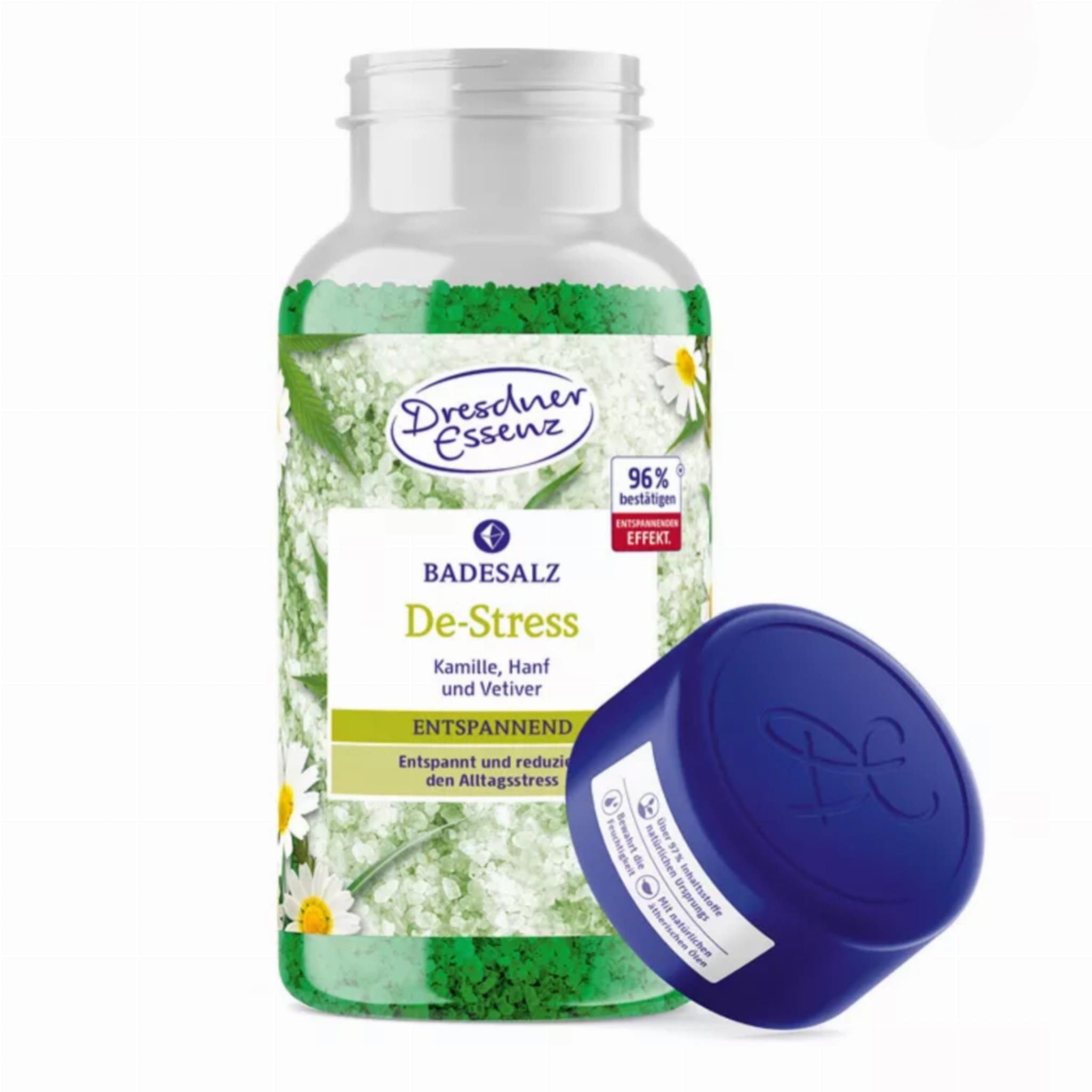 Kojąca sól do kąpieli DE-STRESS z solą Epsom zawierającą magnez, wzbogacona naturalnym olejkiem eterycznym z wetiweru, olejem konopnym i ekstraktem z rumianku. W połączeniu z ciepłą wodą sól do kąpieli działa równoważąco i relaksująco na ciało i duszę. Pomaga zredukować codzienny stres, zapewnia relaks i dobre samopoczucie. Nasze sole do kąpieli wzbogacone są o cenną sól Epsom. Sól Epsom ma wysoką zawartość magnezu i jest używana podczas kąpieli, aby pomóc zregenerować i odciążyć organizm. Pomaga zrelaksować się i zmniejszyć codzienny stres.