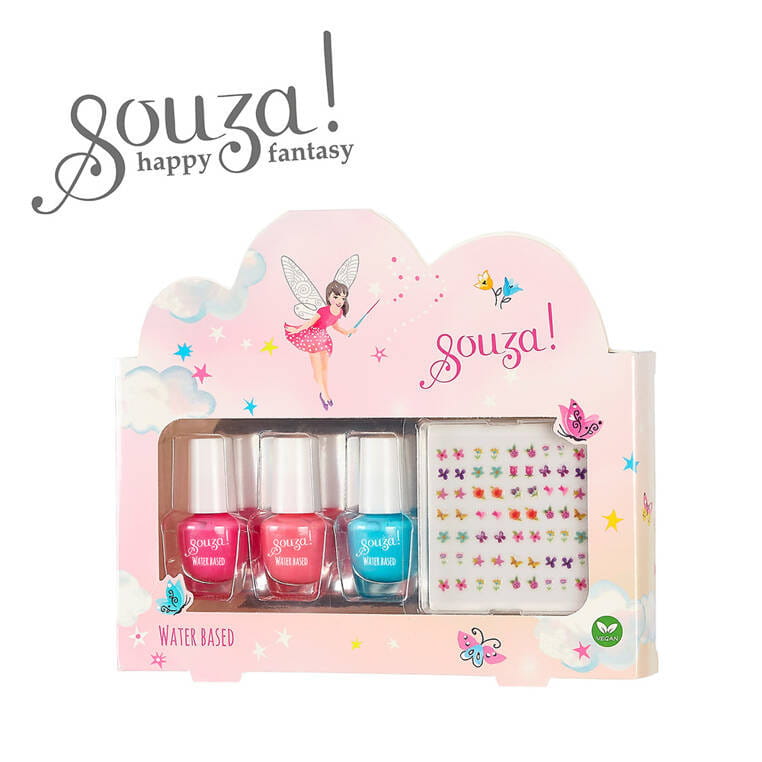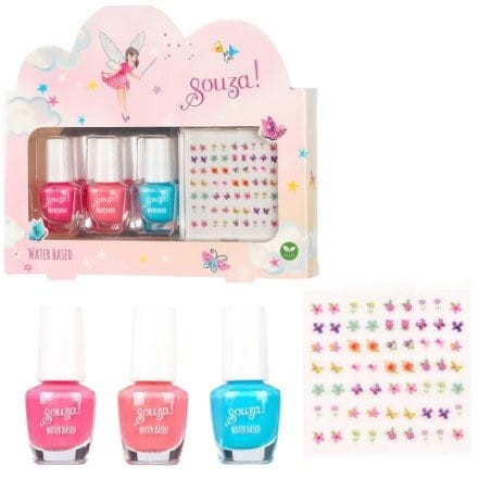 Zestaw lakierów do paznokci dla dzieci Elf holenderskiej marki Souza! W jego skład wchodzą 3 buteleczki lakierów w pięknych kolorach: różowym, morelowym i turkusowym oraz arkusz naklejek na paznokcie.