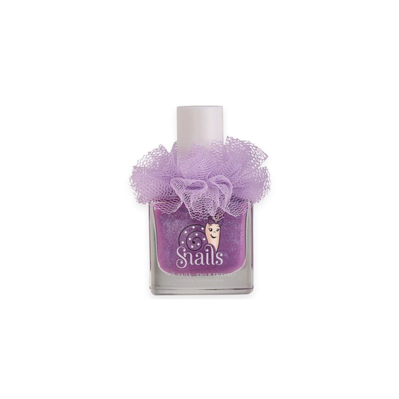 Dziecięcy lakier do paznokci z brokatem, który zmywa się podczas mycia rąk mydłem lub w kąpieli. Lakier na bazie wody Snails w połyskującym, fioletowym kolorze z brokatem. Lakier dziecięcy całkowicie bezpieczny, bezwonny, pozbawiony wszelkich szkodliwych substancji. Lakier ładnie się rozprowadza, szybko wysycha, a potem można go łatwo usunąć. Manicure dla dziewczynki w kolorze delikatnego fioletu i mieniącymi się drobinkami, wymarzony i bezpieczny.