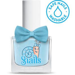 Dziecięcy lakier do paznokci z brokatem, który zmywa się podczas mycia rąk mydłem lub w kąpieli. Lakier na bazie wody Snails w połyskującym, błękitnym kolorze. Lakier dziecięcy całkowicie bezpieczny, bezwonny, pozbawiony wszelkich szkodliwych substancji. Lakier ładnie się rozprowadza, szybko wysycha, a potem można go łatwo usunąć. Manicure dla dziewczynki w kolorze niebieskim z metaliczną poświatą i mieniącymi się drobinkami, wymarzony i bezpieczny.