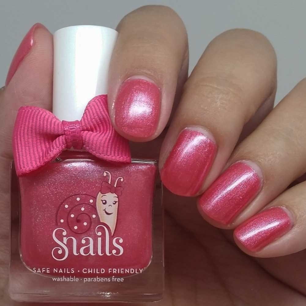 Dziecięcy lakier do paznokci z brokatem, który zmywa się podczas mycia rąk mydłem lub w kąpieli. Lakier na bazie wody Snails w połyskującym, różowym kolorze disco. Lakier dziecięcy całkowicie bezpieczny, bezwonny, pozbawiony wszelkich szkodliwych substancji. Lakier ładnie się rozprowadza, szybko wysycha, a potem można go łatwo usunąć. Manicure dla dziewczynki w kolorze różowym z metaliczną poświatą i mieniącymi się drobinkami, wymarzony i bezpieczny.