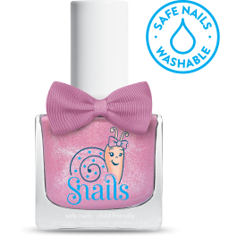 Dziecięcy lakier do paznokci z brokatem, który zmywa się podczas mycia rąk mydłem lub w kąpieli. Lakier na bazie wody Snails w połyskującym, różowym kolorze z brokatem. Lakier dziecięcy całkowicie bezpieczny, bezwonny, pozbawiony wszelkich szkodliwych substancji. Lakier ładnie się rozprowadza, szybko wysycha, a potem można go łatwo usunąć. Manicure dla dziewczynki w kolorze delikatnego różu i mieniącymi się drobinkami, wymarzony i bezpieczny.