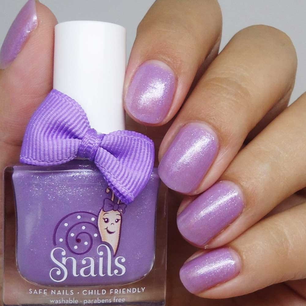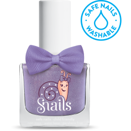 Dziecięcy lakier do paznokci z brokatem, który zmywa się podczas mycia rąk mydłem lub w kąpieli. Lakier na bazie wody Snails w połyskującym, fioletowym kolorze z brokatem. Lakier dziecięcy całkowicie bezpieczny, bezwonny, pozbawiony wszelkich szkodliwych substancji. Lakier ładnie się rozprowadza, szybko wysycha, a potem można go łatwo usunąć. Manicure dla dziewczynki w kolorze liliowym i mieniącymi się drobinkami, wymarzony i bezpieczny.