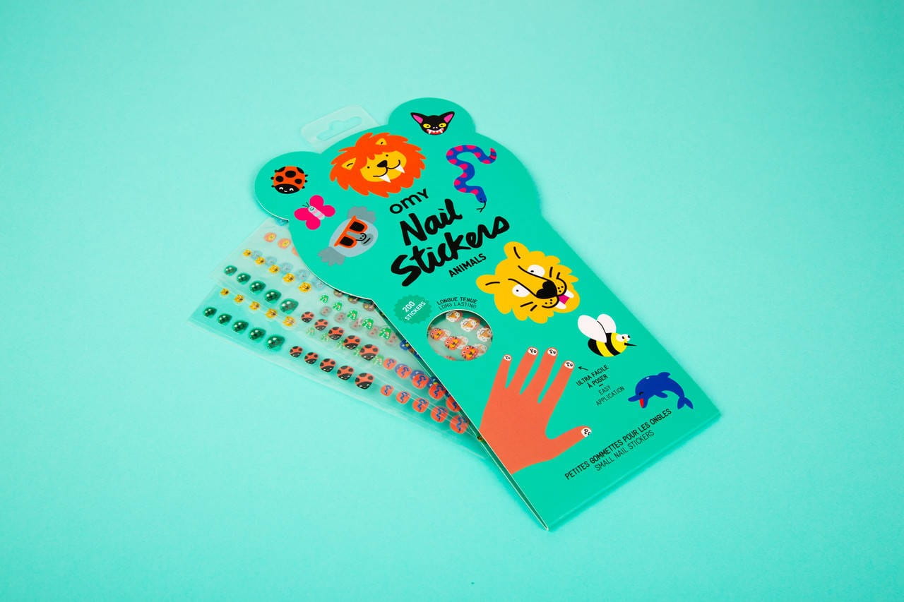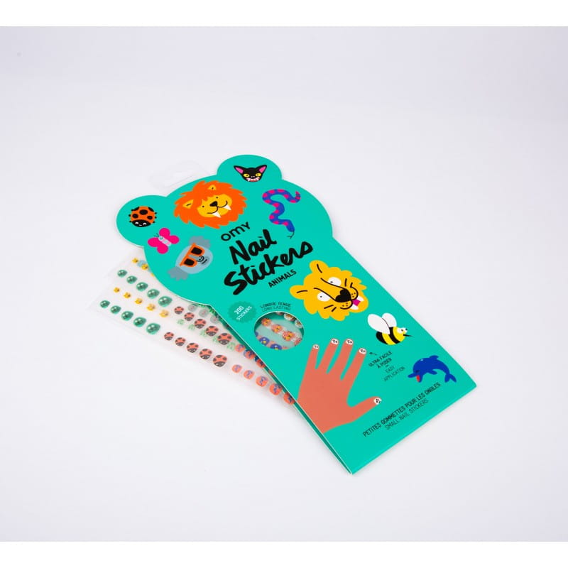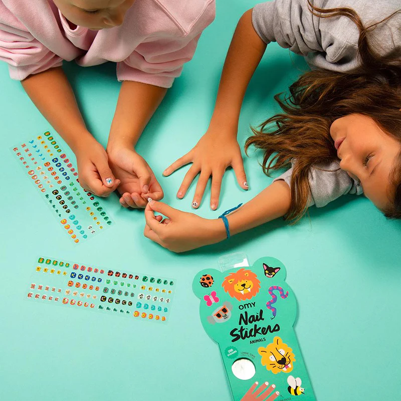 Kolorowe naklejki na paznokcie omy udekorują paluszki dziewczynki. Spośród 200 naklejek można wybrać urocze wzory w delfiny, pandę, motyla, czy biedronkę. Mogą być przyklejane na lakier lub bezpośrednio na płytkę paznokcia. Wesołe naklejki na paznokcie są całkowicie bezpieczne, nietoksyczne, łatwe do przyklejenia i usunięcia. Naklejki te utrzymują się przez co najmniej 1 do 2 dni i nie odklejają się podczas mycia rąk.
