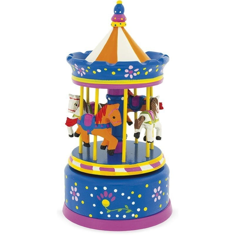 Drewniana pozytywka Ulysse z kolorowymi konikami na karuzeli MERRY-GO-ROUND w przepięknych żywych kolorach. Dopracowane szczegóły i przepiękne kolory sprawią że pozytywka to nie tylko relaksacyjna muzyka dla maluszka ale też elegancka dekoracja dziecięcego pokoiku. Pozytywka jest nakręcana od spodu i gra uspokajającą Kołysankę Frères Jacques (Jean-Philippe Rameau). Drewniane figurki na karuzeli kręcą się podczas muzyki jak na karuzeli.