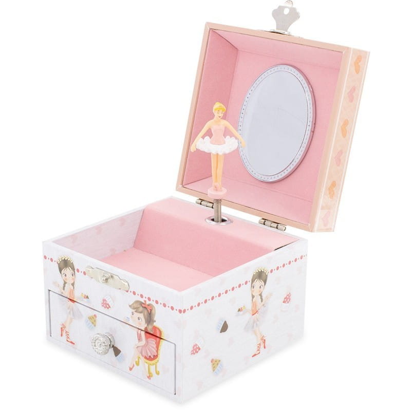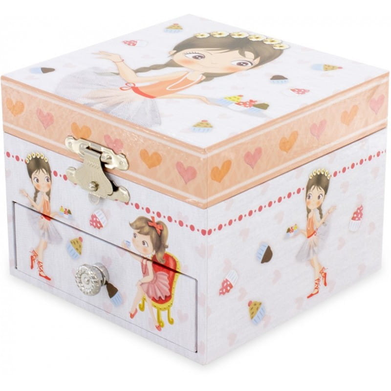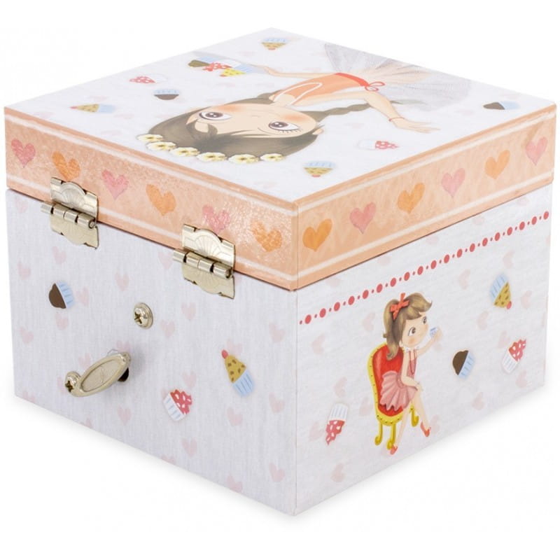 Przepiękna szkatułka francuskiego producenta Ulysse zachwyca niezwykłym designem, kolorami i starannym wykonaniem. Różowa szkatułka na wieczku której znajduje się obrazek małej dziewczynki z ciastkami mufinkami. Po otworzeniu wieczka szkatułki i wcześniejszym nakręceniu mechanizmu pozytywki wewnątrz mała balerina zaczyna tańczyć w takt muzyki. Dopracowane szczegóły i przepiękne kolory sprawią że szkatułka to nie tylko relaksacyjna muzyka dla maluszka ale też elegancka dekoracja dziecięcego pokoiku. Aby nakręcić mechanizm muzyczny, należy przekręcić mechanizm znajdujący z tyłu szkatułki. Pozytywka gra uspokajającą melodię I Got Rhythm (Gershwin).