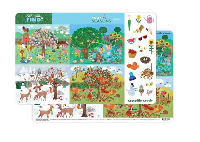 Dwustronna podkładka Crocodile Creek zabezpieczająca stół przed pobrudzeniem i ułatwiająca sprzątanie po posiłku. Z jednej strony przedstawia cztery pory roku, z drugiej szczegóły do odnalezienia.