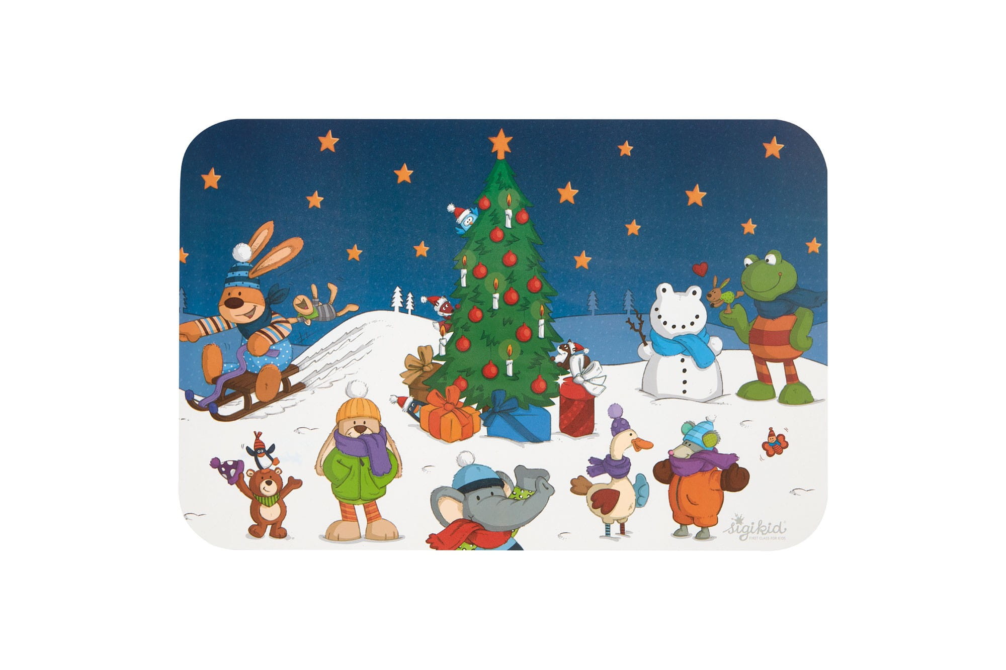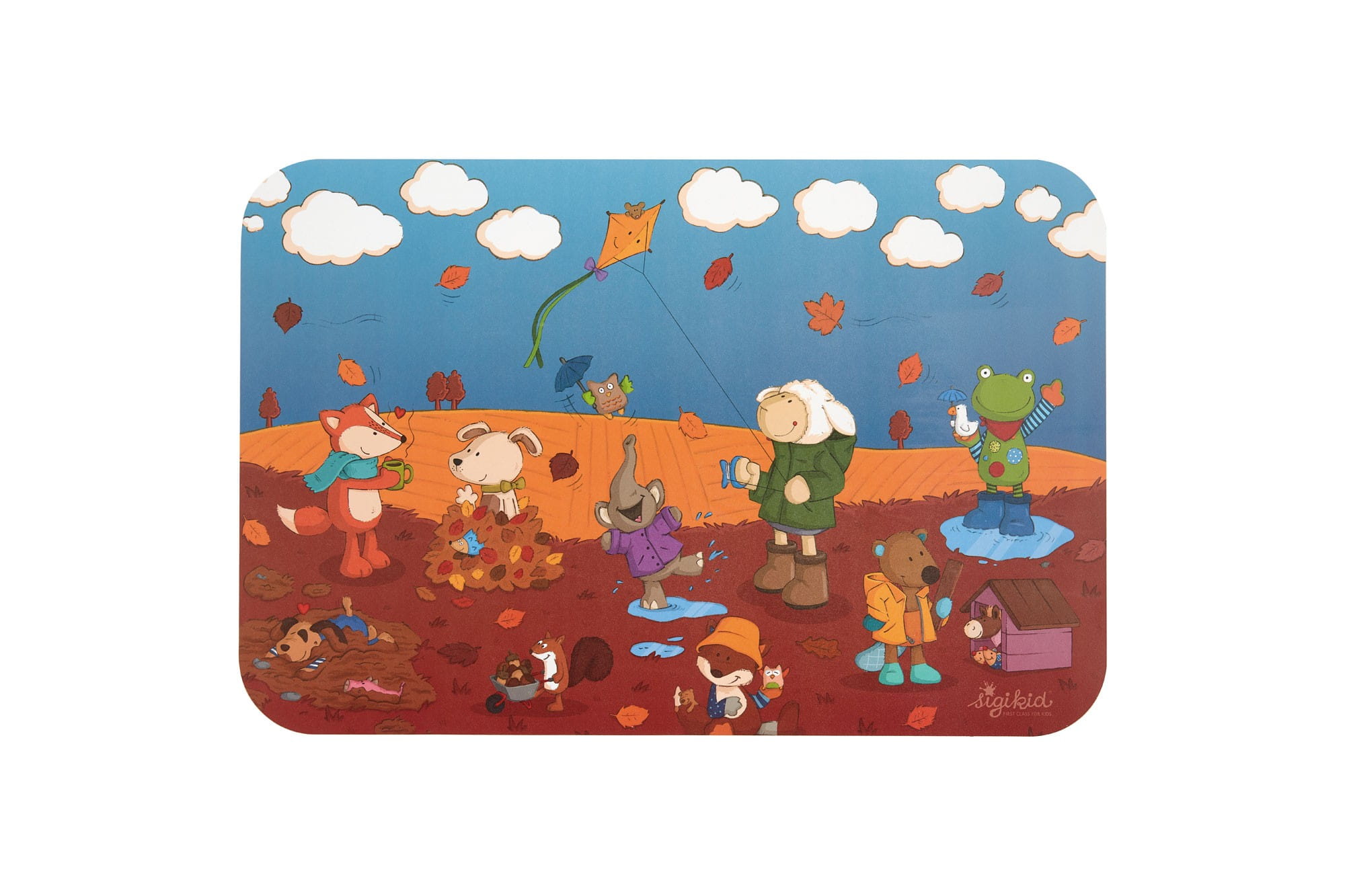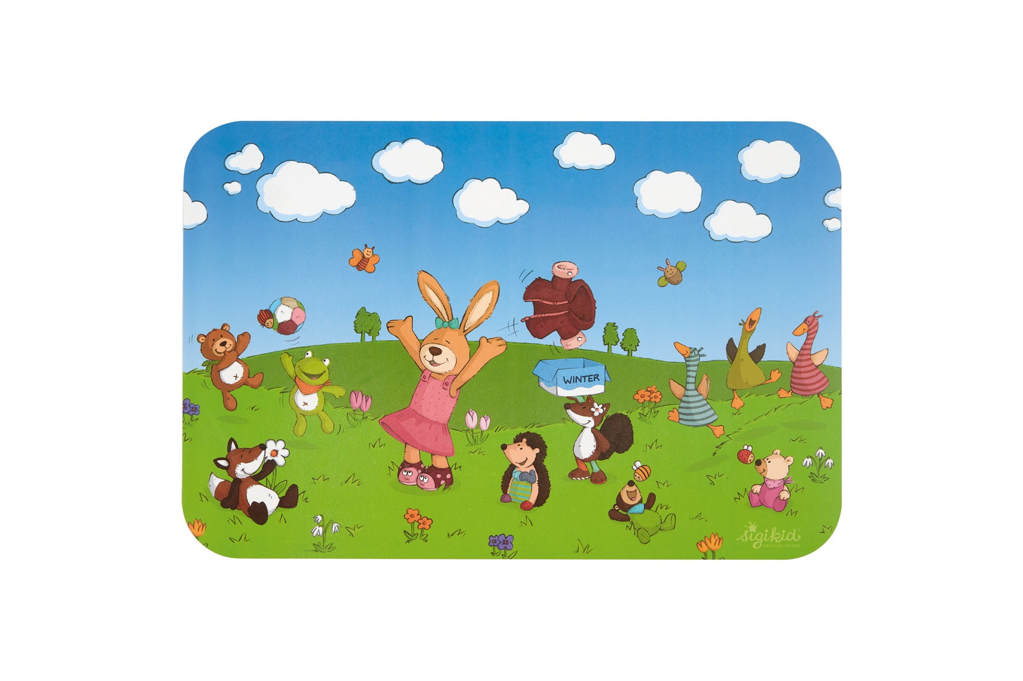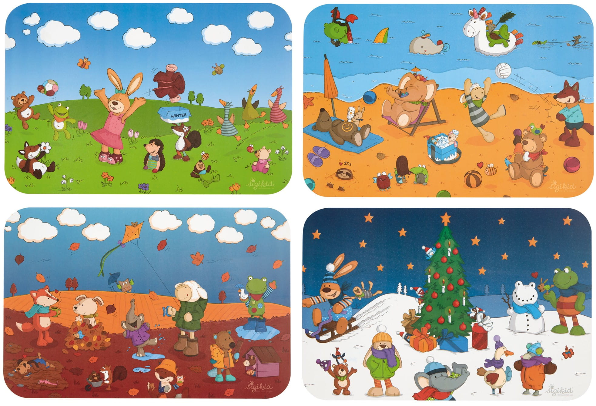 Kolorowe podkładki Sigikid zabezpieczająca stół przed pobrudzeniem i ułatwiająca sprzątanie po posiłku. Zestaw podkładek liczy 4 sztuki i obrazuje 4 pory roku. Podkładki po posiłku wystarczy przetrze ściereczką, by znów były czyściutkie.