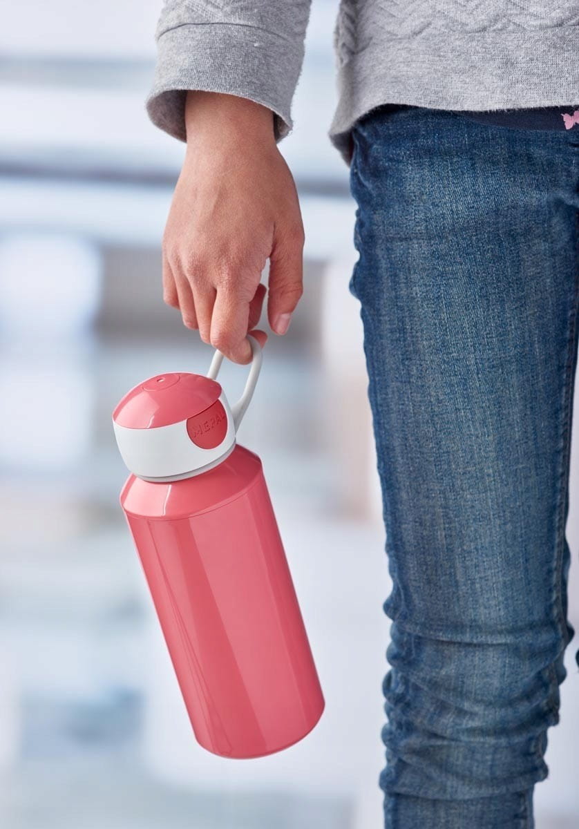 Szczelny Bidon dla dzieci "naciśnij i pij" ma dziubek, który wyskakuje po przyciśnięciu guzika. Niecieknący bidon jest łatwy w użyciu przez dzieci, trwały i lekki. Wystarczy nacisnąć guzik by z nakrętki wysunął się dziubek i już można ugasić pragnienie. Butelka dla dzieci Mepal ma wszystkie najważniejsze cechy idealnej butelki do picia. Bidon z łatwością mieści się w dziecięcym plecaku, jest szybki i prosty w obsłudze. Pojemność 400 ml. Do butelki dołączony jest zaczep, dzięki któremu bidon można przyczepić do plecaka czy szlufki od spodni.