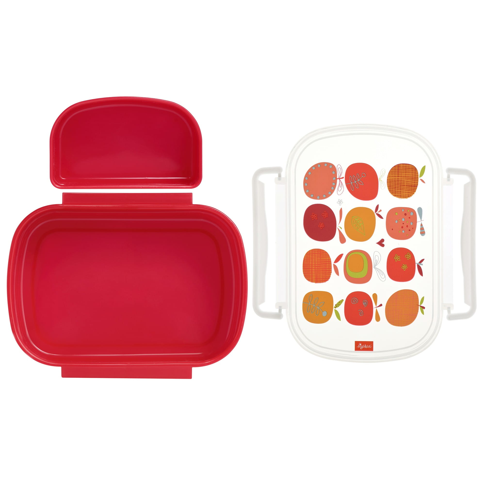 Pojemniki na jedzenie z przegródką, czerwona śniadaniówka sigikid Lunch Box Red Apples zamykana na zatrzaski. Rozmiar idealnie pasuje do dziecięcego plecaka.