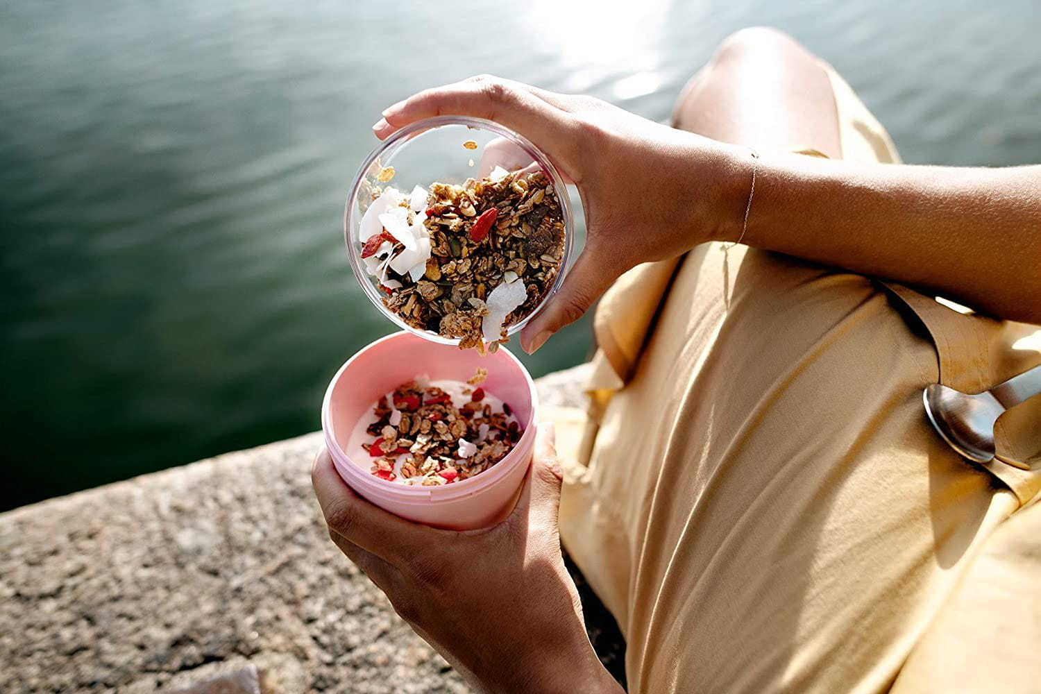 Lunchbox o modułowej konstrukcji zawiera dwa oddzielne pojemniki o pojemności 500 ml i 200 ml. Powoli zabrać ze sobą, a potem połączyć jogurt z musli, sałatkę z dressingiem, zupę z grzankami, owsiankę z owocami, czy makaron z warzywami i mięsem i zjeść pełnowartościowy posiłek poza domem.
